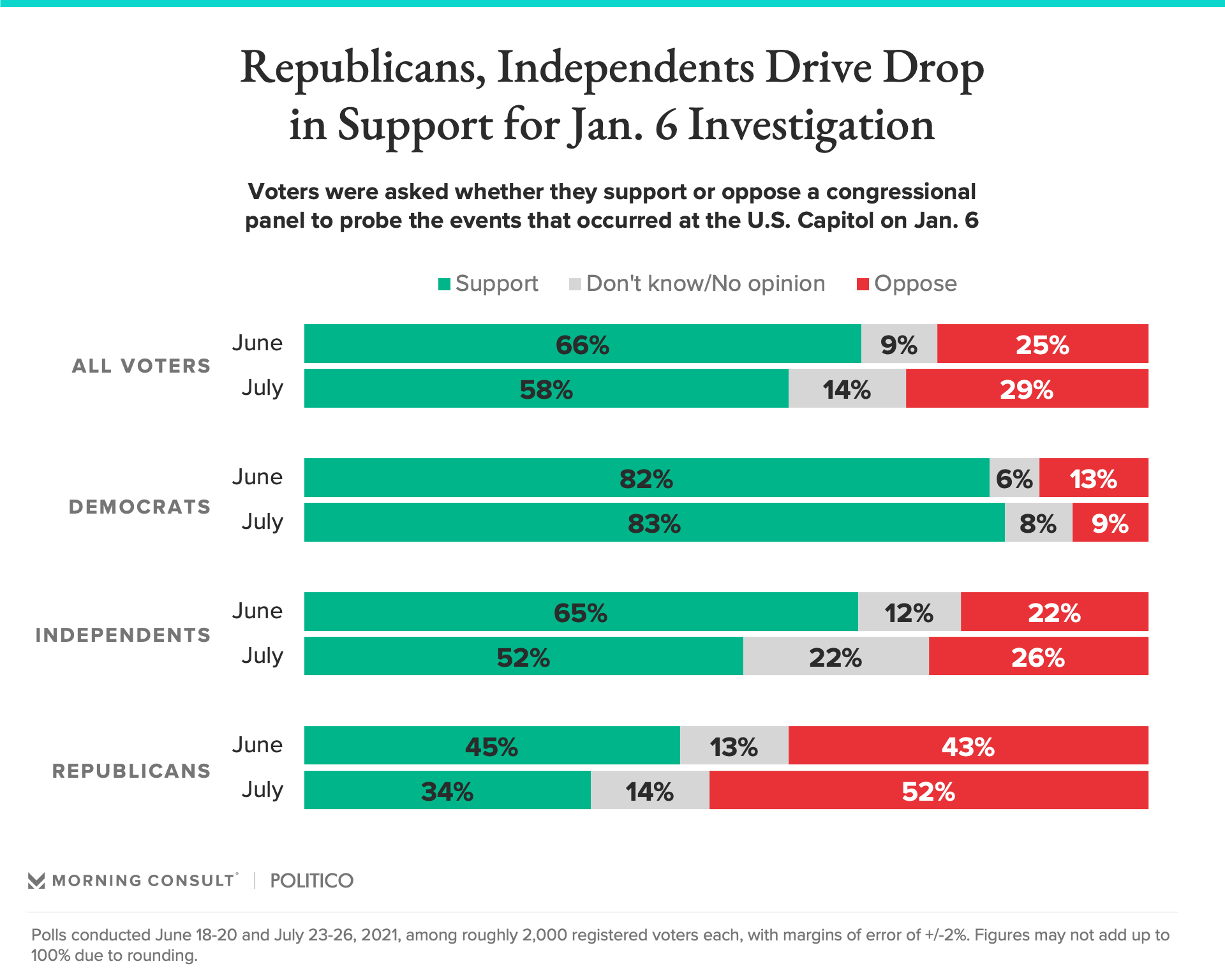 According to the July 23-26 survey, 58 percent of voters said they support a congressional commission to investigate the Jan. 6 attack on the U.S. Capitol, compared with 29 percent who oppose it. Overall support for the probe is down 8 percentage points since a poll conducted June 18-20, while the share opposed or uncertain rose by smaller amounts.