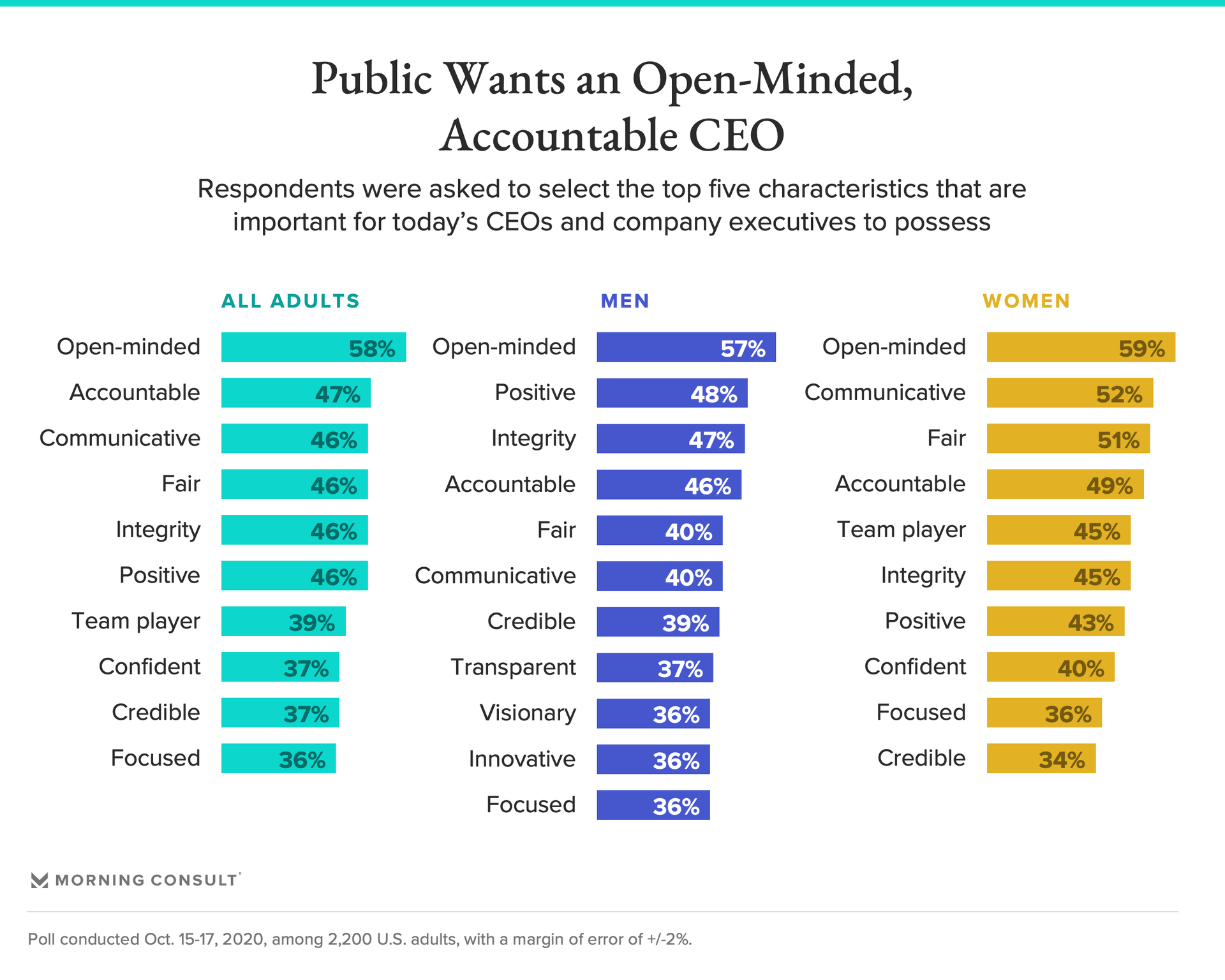 The public wants a leader who is open-minded and accountable, according to the Oct. 15-17 survey. Characteristics such as communicativeness, of which 46 percent of respondents selected as one of their “top five” characteristics vital for a top executive to have, are especially important during the COVID-19 era, when many Americans are doing the majority of their professional communication via computer screen.
