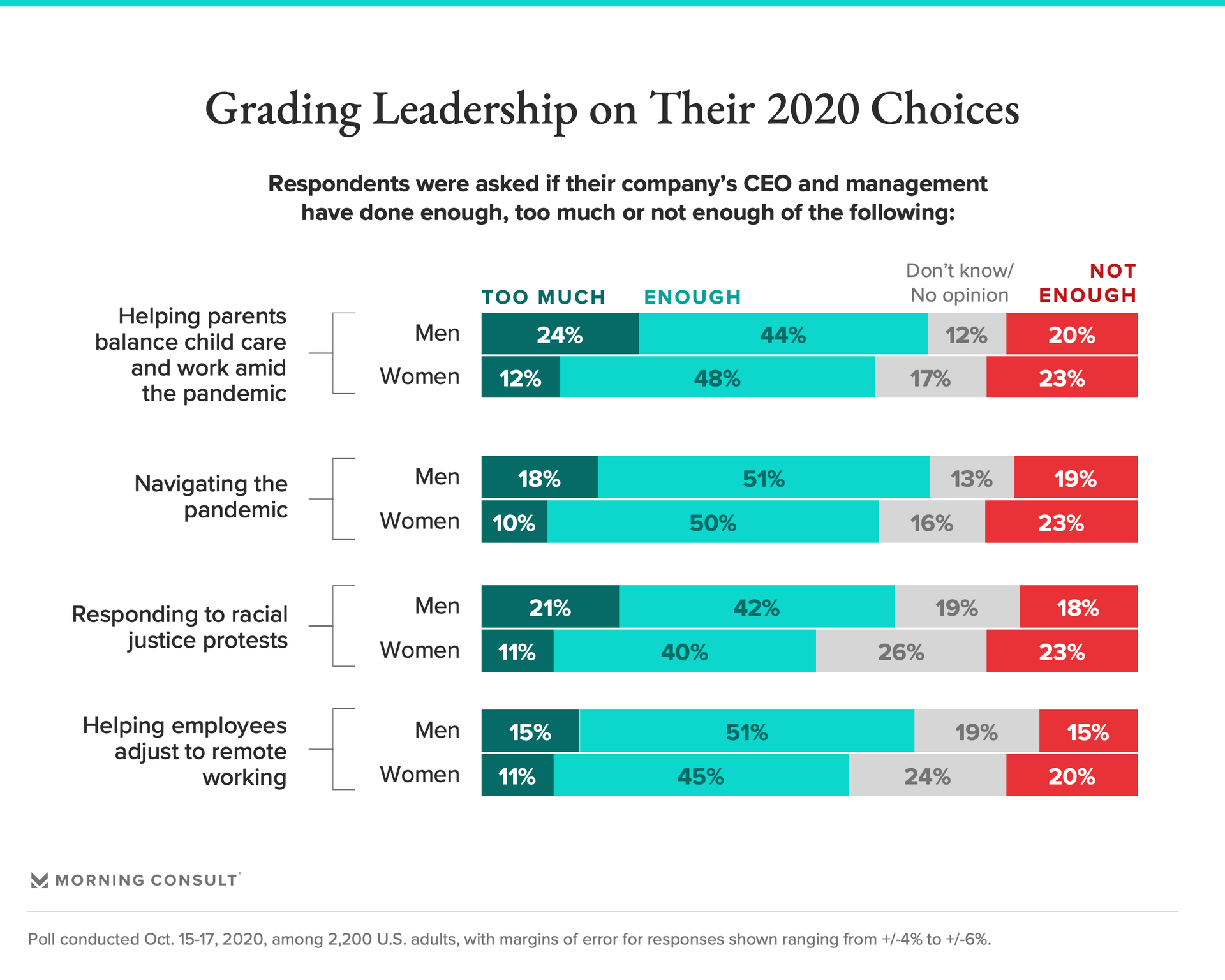 24% of men said their CEOs are helping parents balance child care and work “too much” during the pandemic, twice as much as the share of women who said the same (12%).