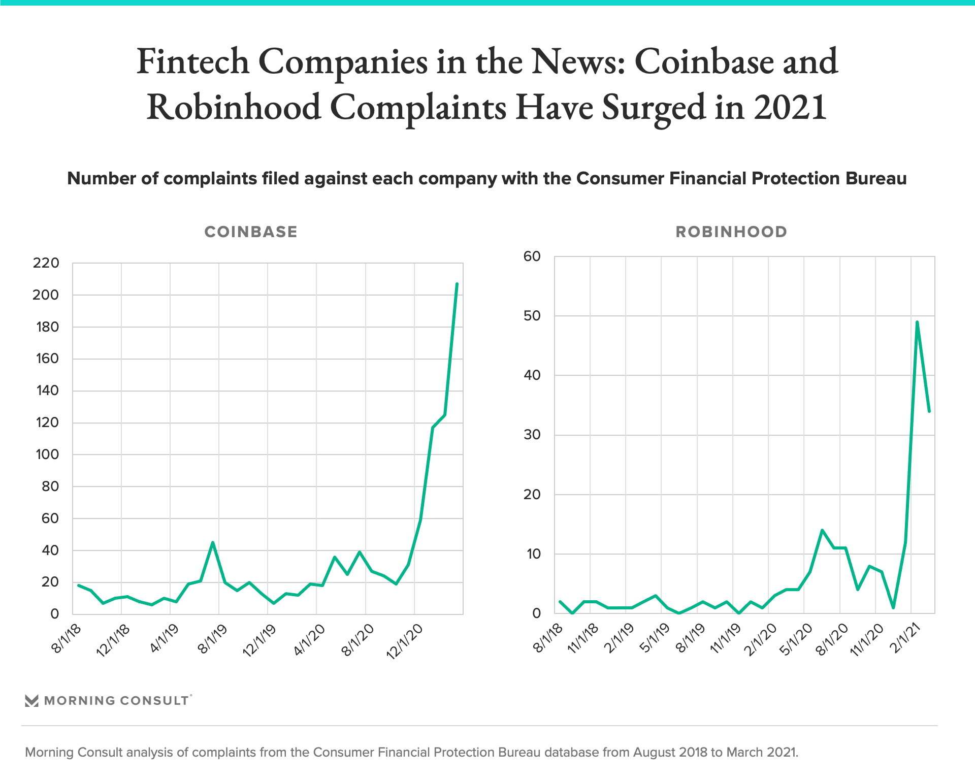 Since the beginning of 2021, however, complaints have risen again as fintech issues suddenly dominated news cycles, including Robinhood Markets Inc.’s involvement in the GameStop Corp. trading frenzy, and the major public trading debut of Coinbase Global Inc.
