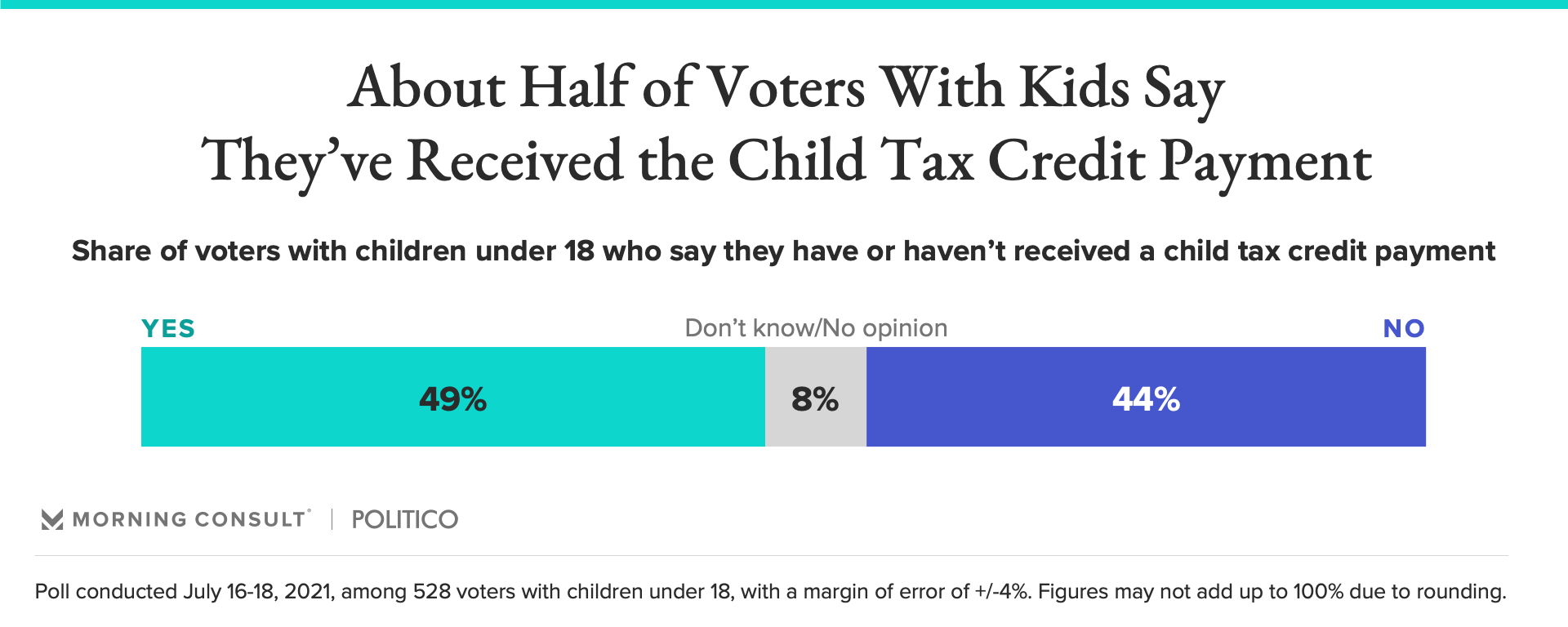 Among voters with a child under 18 years old, about half said they’ve received a child tax credit as of July 18 (payments began July 15). Registered voters are less likely to be among the categories of Americans who are difficult for the IRS to reach.