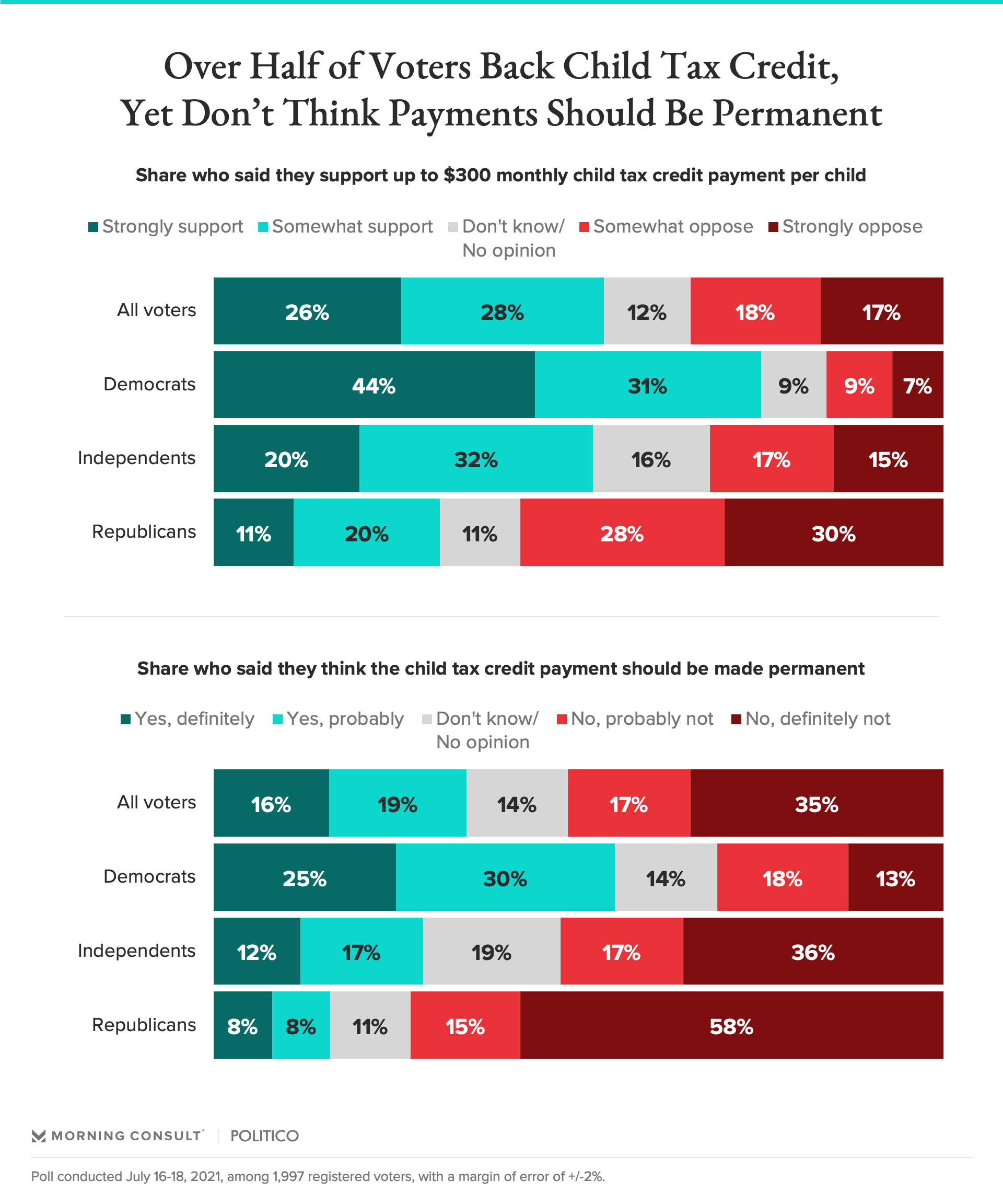 Republican voters are much less likely than Democrats to support the payments at 31 percent, and only 16 percent say they should be permanent. An overwhelming 73 percent say the child tax credit shouldn’t become permanent.