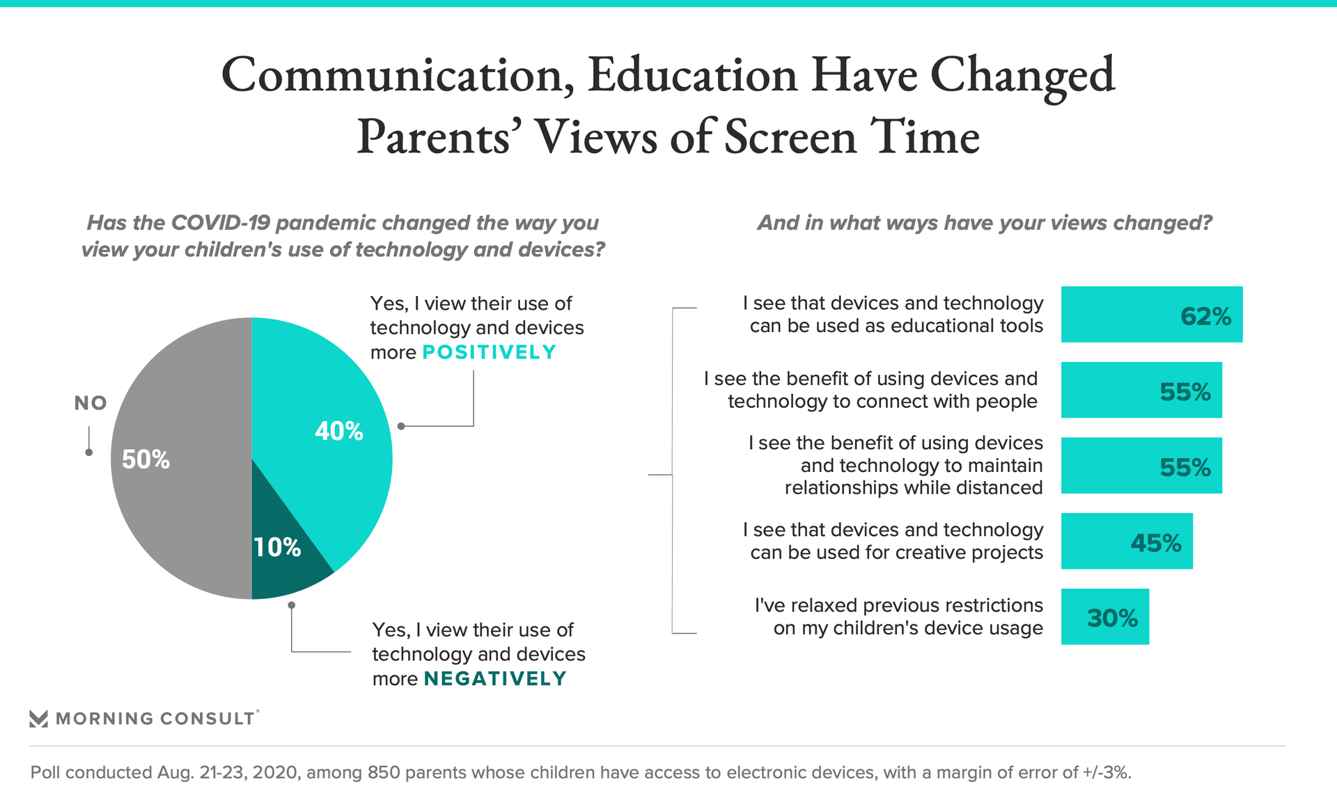 Among parents who view technology use more positively, 55% said they now see how devices can help connect children with friends and family and maintain relationships while physically distanced.