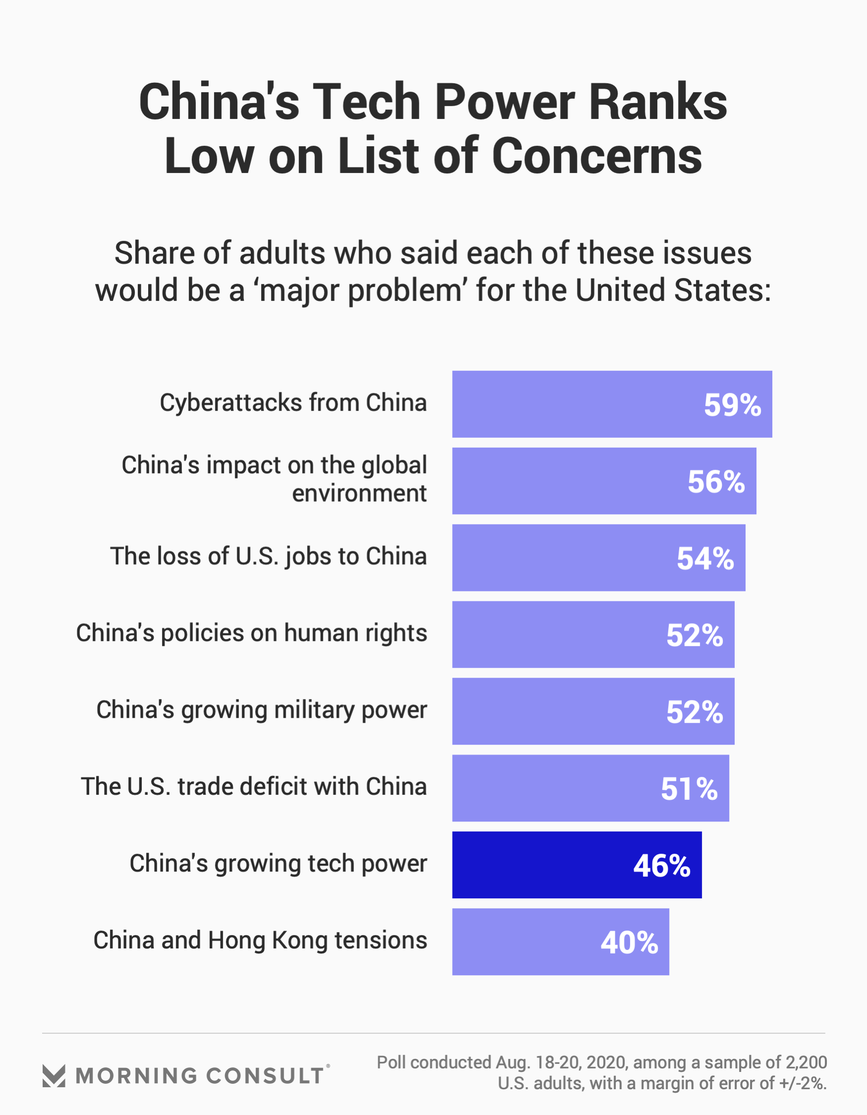 46% said China’s growing technological power is a major problem for the U.S., compared with 59% who said the same about cyberattacks from China.