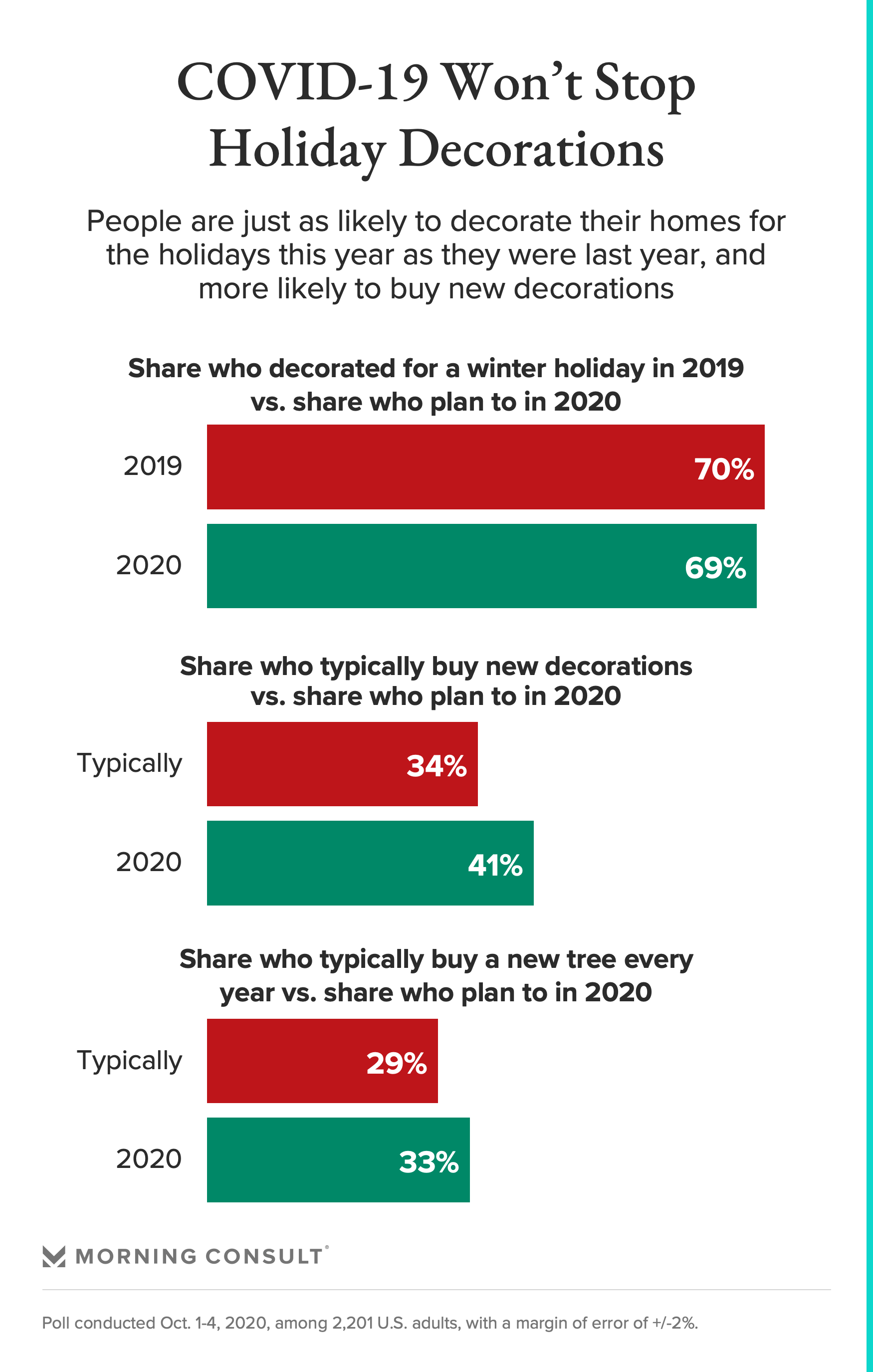 An Oct. 1-4 Morning Consult survey shows that roughly the same share of consumers this year, compared to last, plan to decorate their home for the holidays.