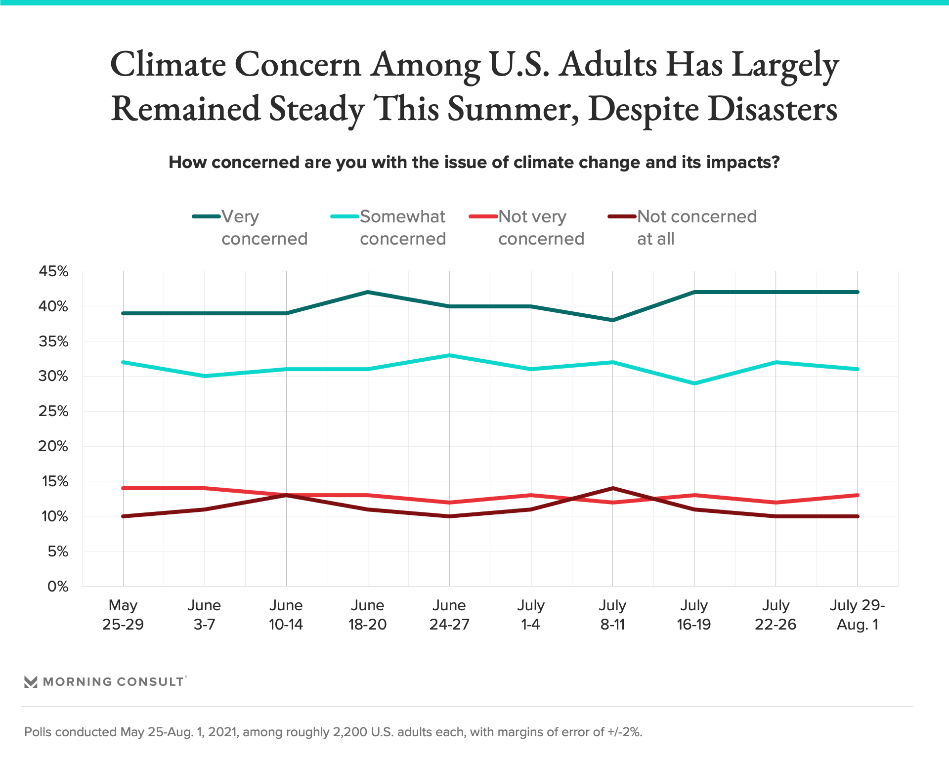 But Morning Consult data shows that alarm over climate change and natural disasters among the U.S. public has not increased as the threats become more tangible. Weekly surveys conducted from late May through early August show that the share of adults who say they are “very concerned” about climate change has largely stagnated, fluctuating between 38 percent and 42 percent. The margin of error for the polls is 2 percentage points.