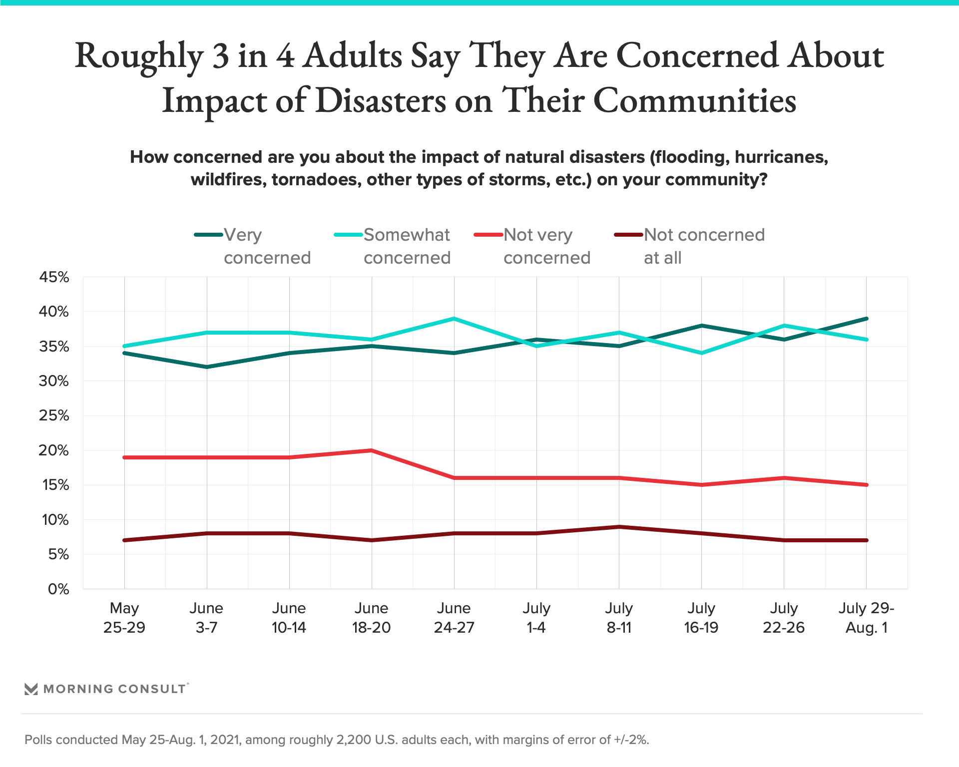 The share who say they are “very concerned” about the impact of natural disasters on their own communities has hovered between 32% and 39% over the course of the summer.