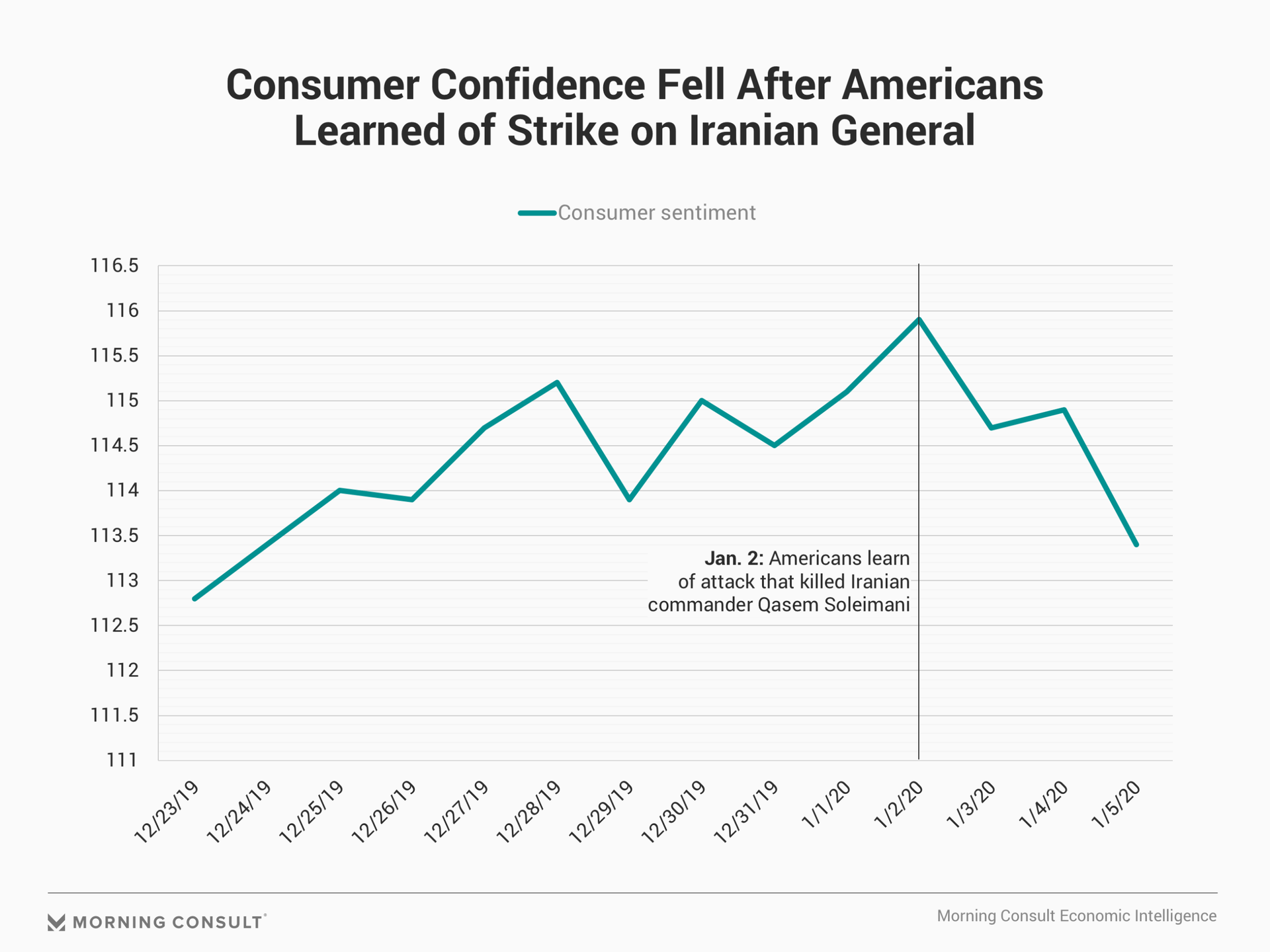 Morning Consult’s Index of Consumer Sentiment fell sharply in the days since Americans woke up on Jan. 3 to the news of Soleimani’s death, stirring up tensions in the oil-rich Middle East. The daily index dropped from 115.9 (the highest point since Morning Consult began tracking consumer sentiment in 2018) to 113.4 over four days, the lowest level since Dec. 23.