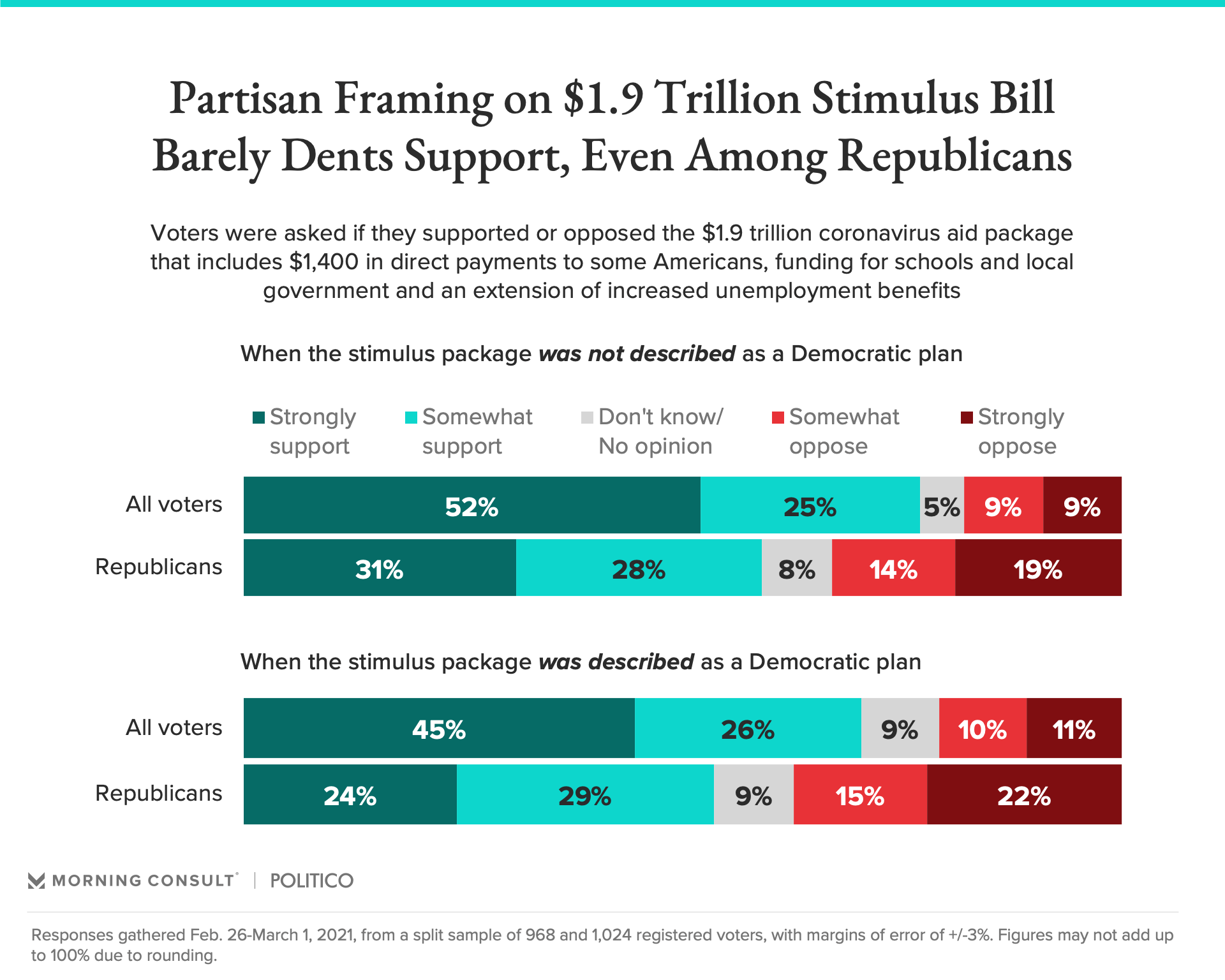 59% of GOP voters say they support the $1.9 trillion stimulus package; 53% of GOP voters who were told it was the Democrats’ plan still backed it.