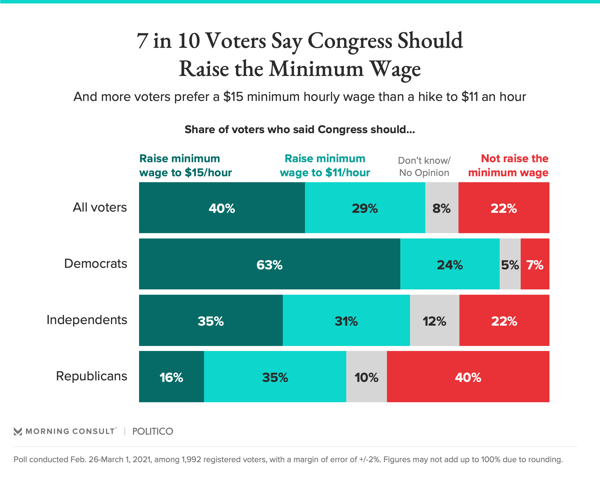 Forty percent preferred taking it all the way up to $15 an hour, while another 29 percent opted for an increase to $11 an hour, which moderate Democratic Sen. Joe Manchin of West Virginia voiced support for last week. Roughly 1 in 5 voters said Congress should not raise the minimum wage at all.
