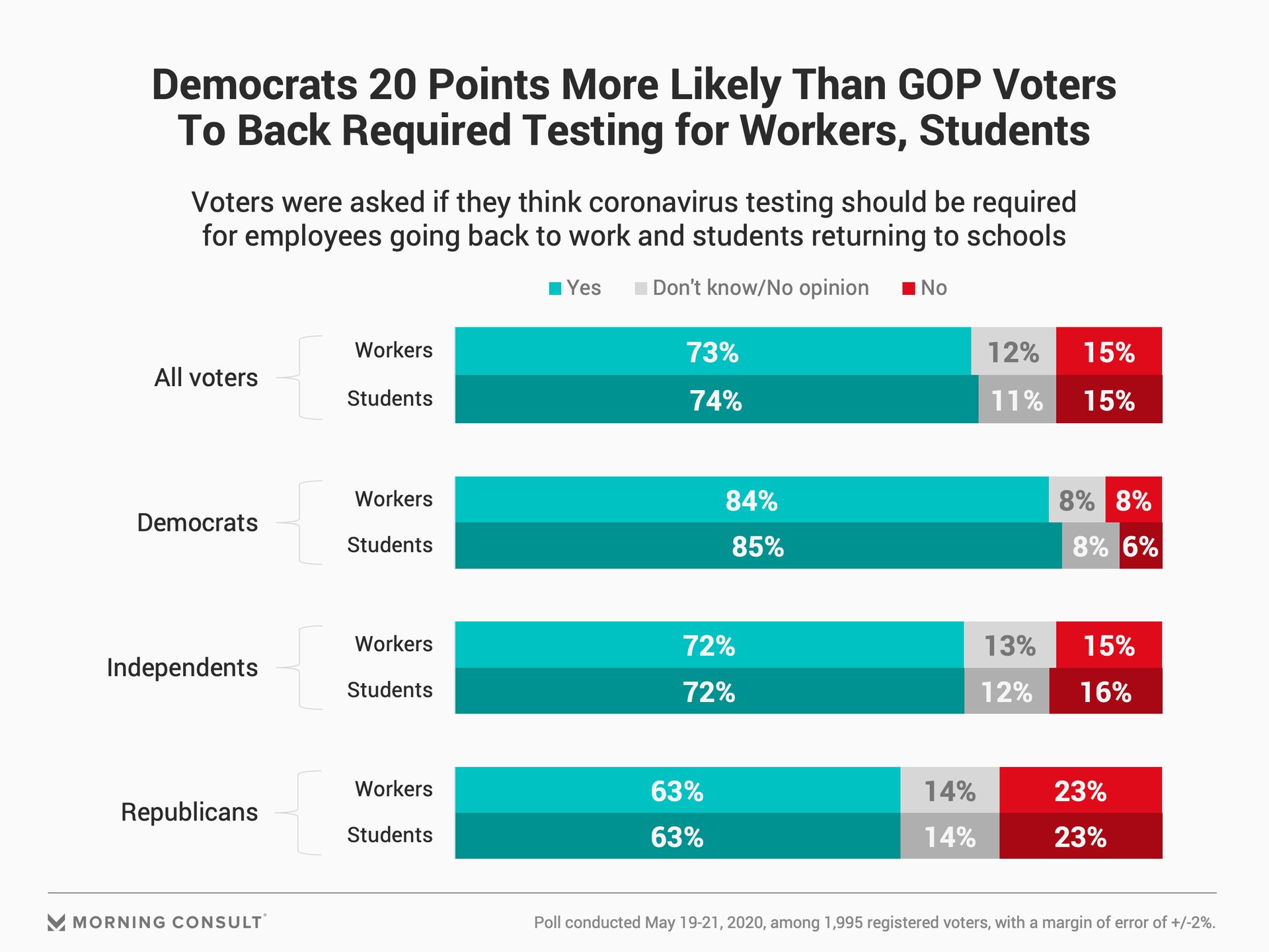 Democrats are roughly 20 points more likely than Republicans to say testing should be mandatory for employees, students before they return to work and school.
