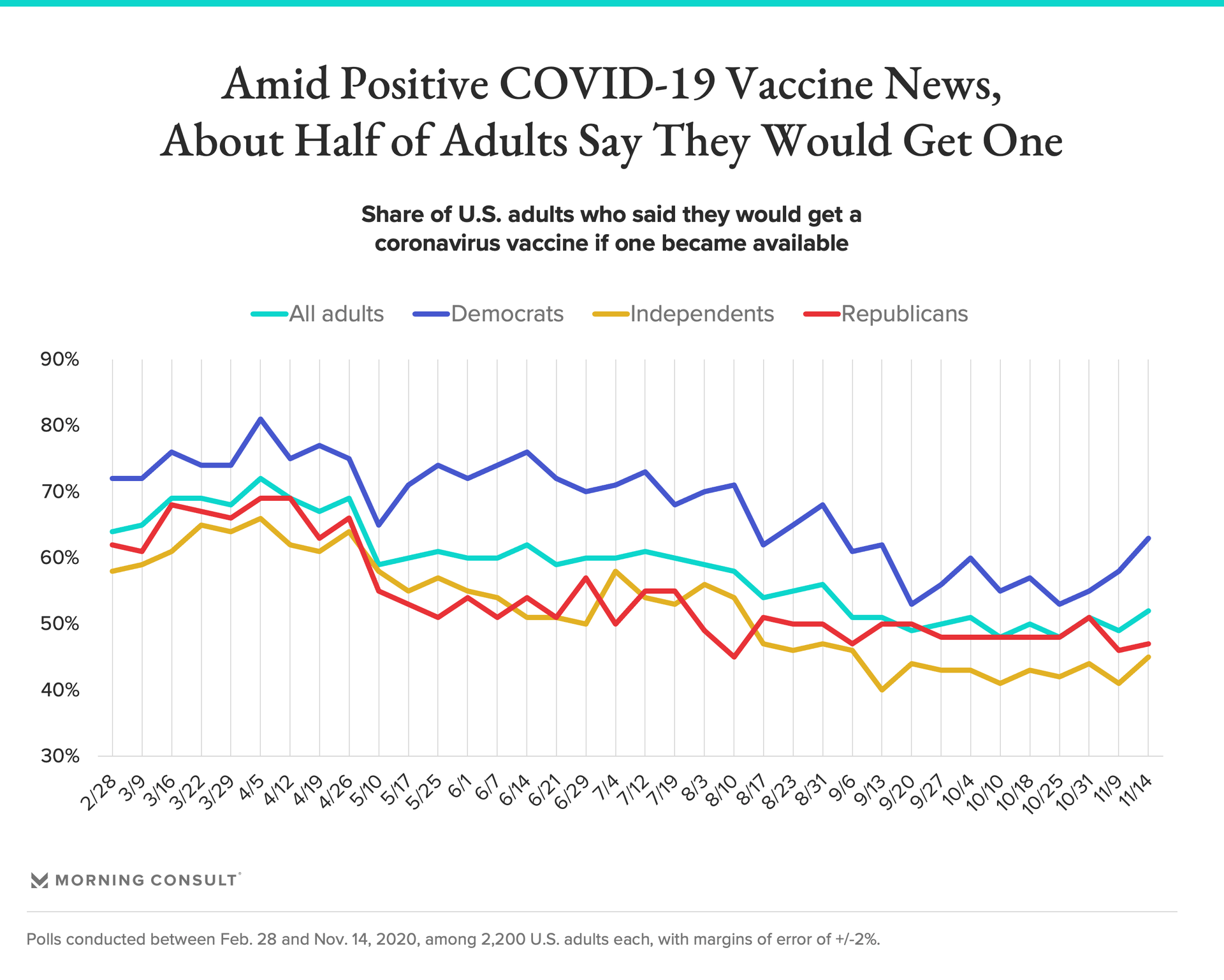 Yet roughly half of Americans remain split about whether they would get a potential coronavirus vaccine, according to a Morning Consult survey conducted Nov. 12-14, which found 52 percent of adults said they would, up just 3 percentage points from the week before. Just under half of people said they either wouldn’t get a vaccine (23 percent) or didn’t know or had no opinion (24 percent).