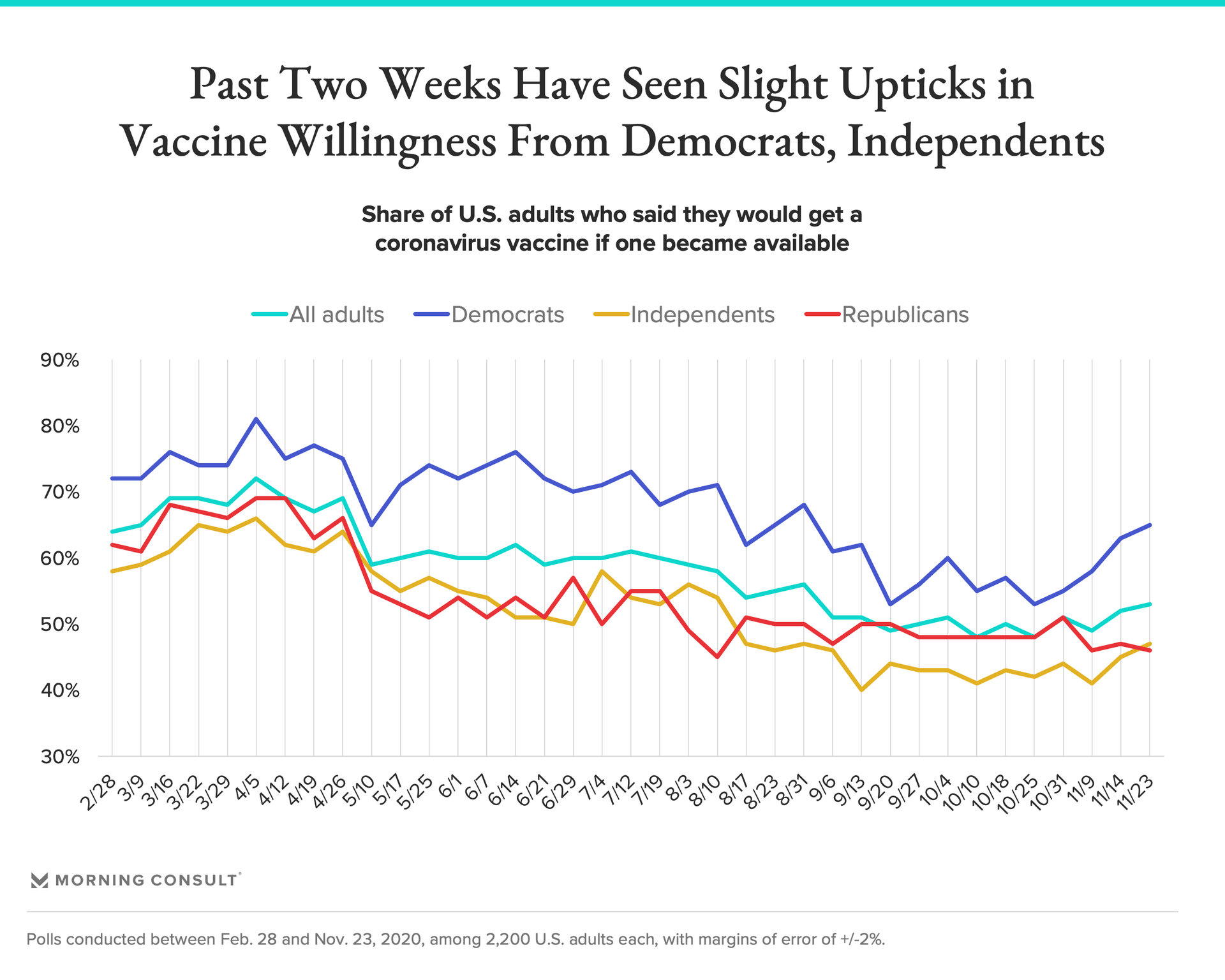 Fifty-three percent of adults now say they would get a coronavirus vaccine if one became available, according to a new Morning Consult poll, a slight uptick from 49 percent the first week of November and the highest level since late August, amid both a surge in infections that’s threatening to overwhelm health systems and a flurry of promising vaccine developments.