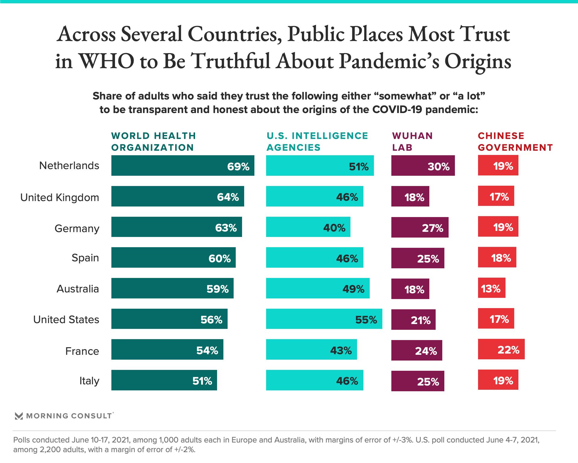 Yet despite the WHO’s early blunders, at least half of adults in six European countries and Australia still trust the international health body to be transparent and honest about the pandemic’s origins, according to new Morning Consult polling that comes as the theory that the coronavirus began spreading after an accident at a Chinese lab gets a closer look.