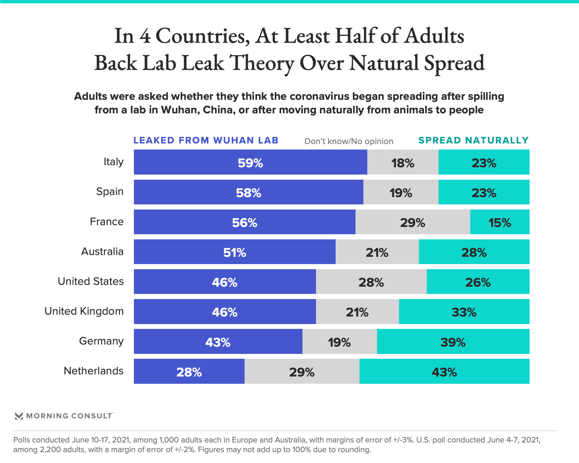 Morning Consult polled 1,000 adults in Australia and each European country from June 10-17, with margins of error of 3 percentage points. The U.S. poll, which has a 2-point margin of error, was conducted June 4-7 among 2,200 adults.