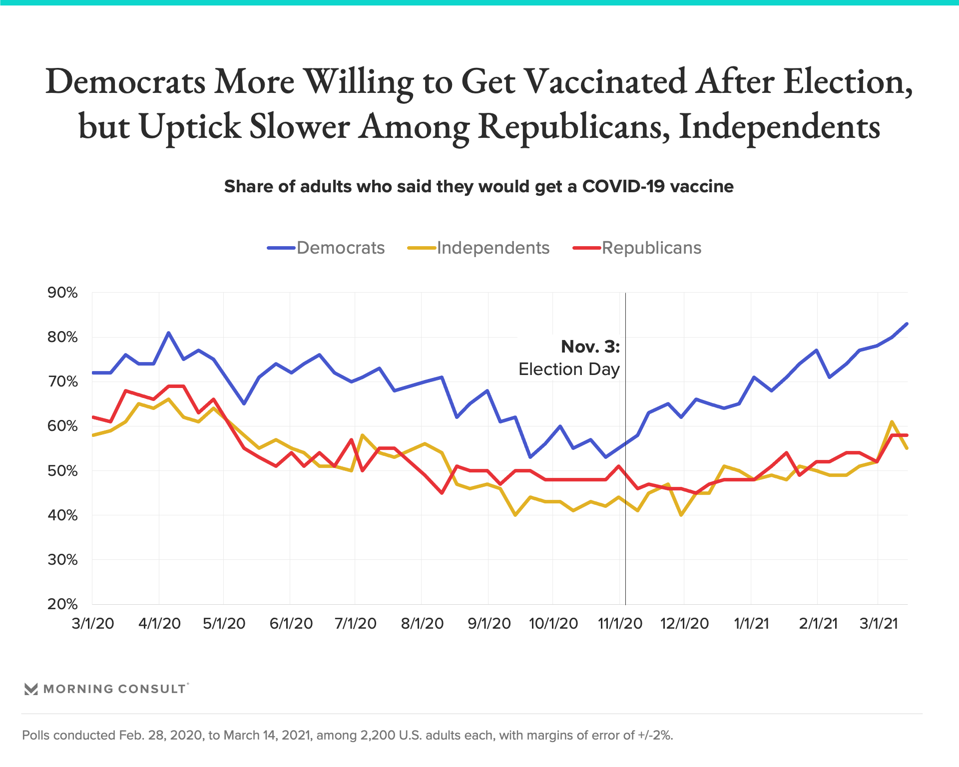 The latest Morning Consult survey was conducted March 12-14 among 2,200 U.S. adults and has a 2-point margin of error.