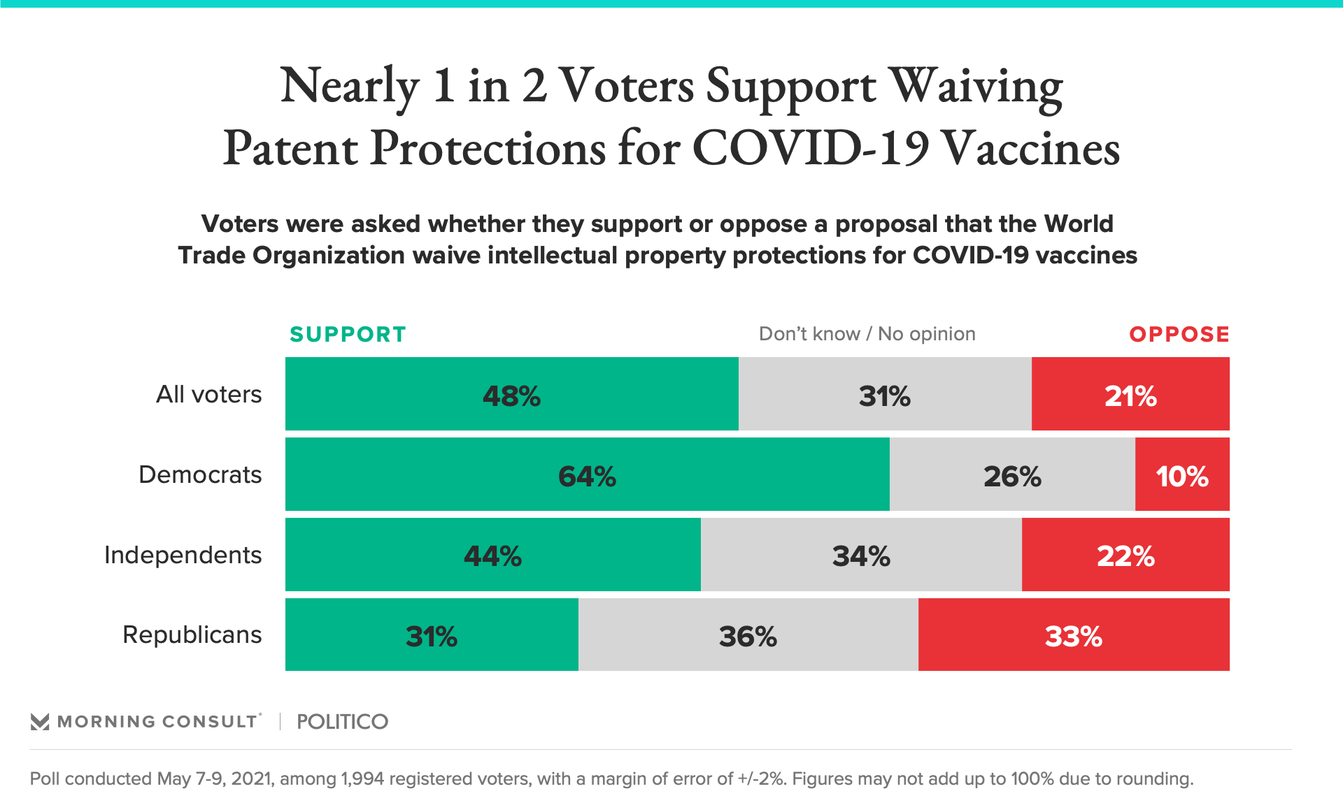 48% of voters said they support waiving patent protections for COVID-19 vaccines, while 21% oppose the move and 31% said they don't know or have no opinion.