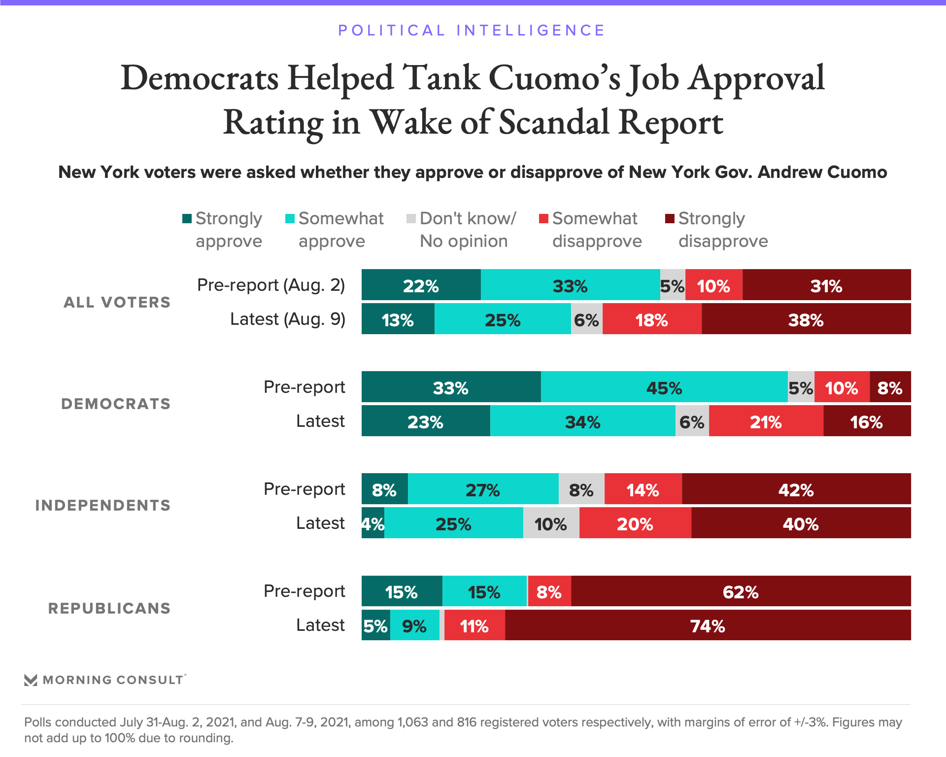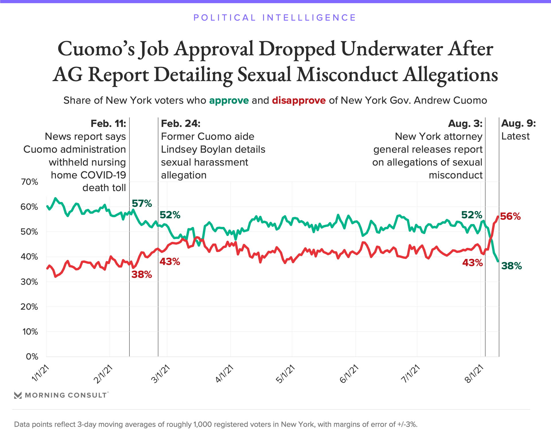 According to the latest Morning Consult Political Intelligence tracking, 38 percent of New York voters approve of Cuomo’s job performance – down 16 percentage points from the day before James released her report – while the share who disapprove rose by 15 points to 56 percent.
