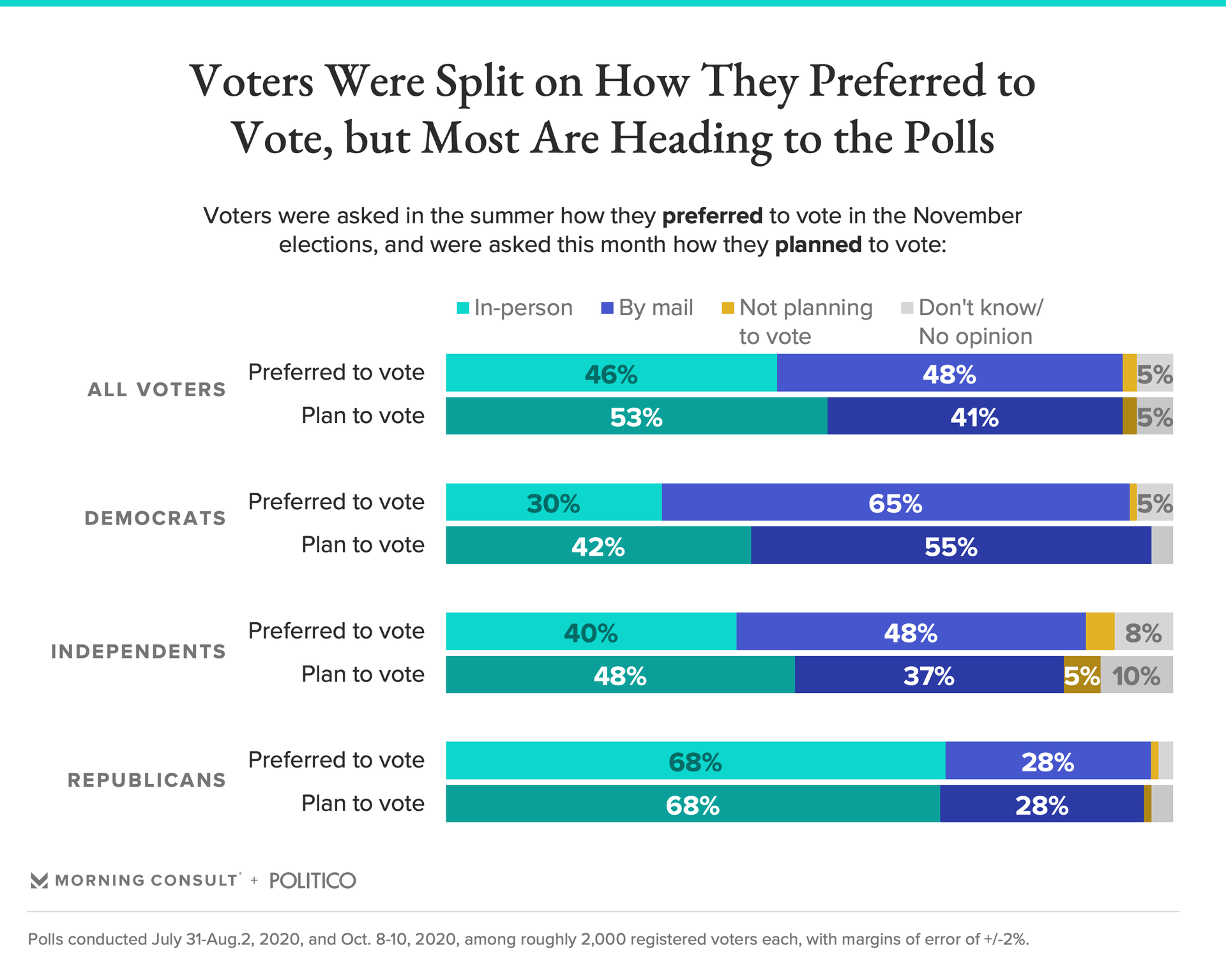 Overall, 53 percent of voters plan to vote in person, compared with 46 percent who said they preferred to do so late in the summer. Roughly 4 in 10 plan to vote by mail, down from 48 percent who said that they preferred to have the mail carrier deliver their ballot.