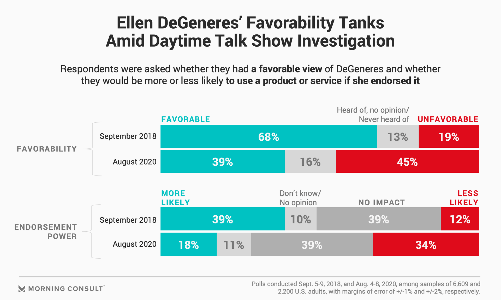 Reports of a toxic work environment at “The Ellen DeGeneres Show” appear to have tainted public perception of the show’s host, according to analysis of Morning Consult trend data, after DeGeneres and several of the show’s producers were caught in a wave of allegations of racism, toxic behavior and sexual harassment.
