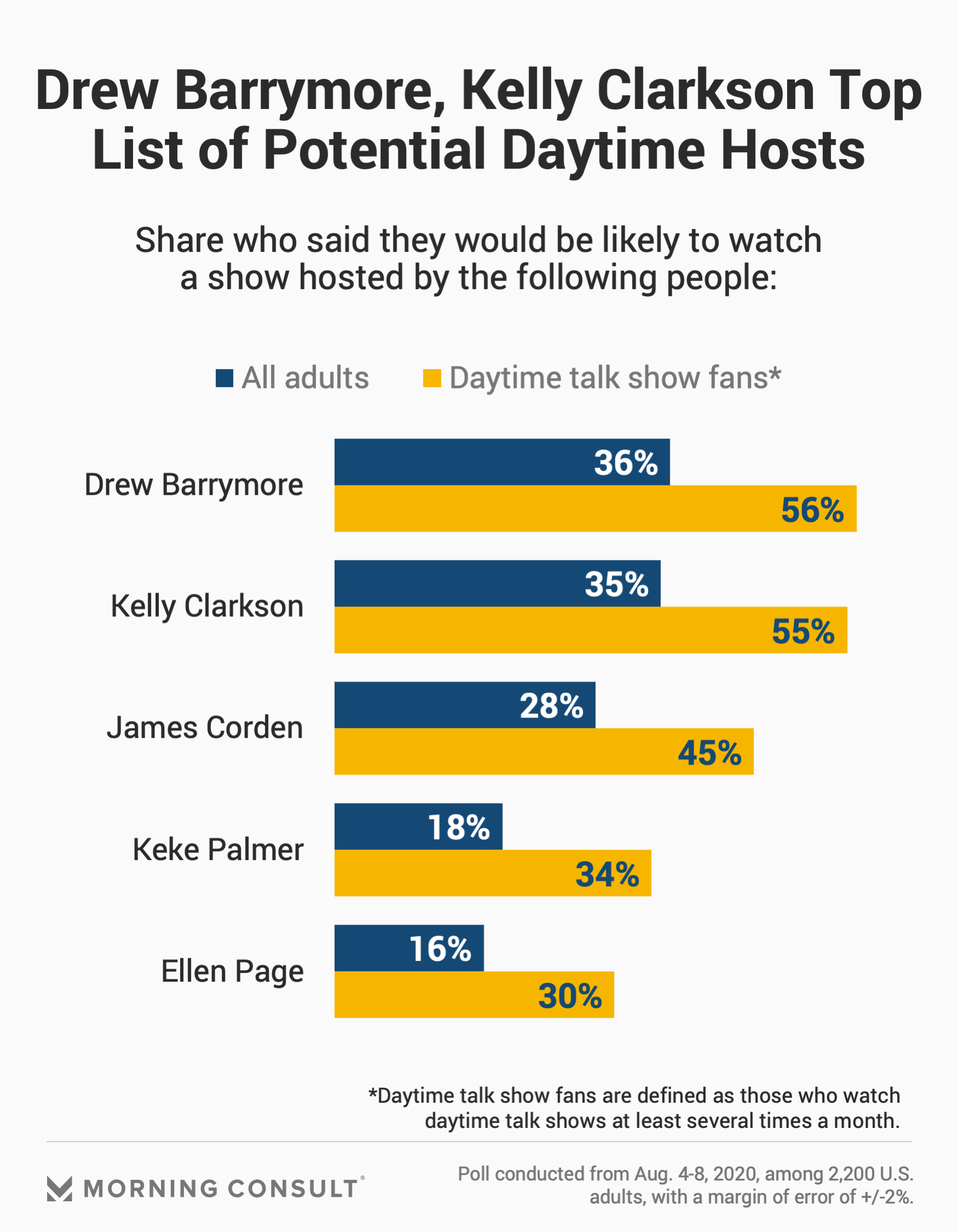 Twenty-eight percent of adults -- including 45 percent of daytime talk show fans -- said they would be likely to watch a daytime program hosted by Corden. Drew Barrymore, whose new daytime program is slated to debut next month, and Kelly Clarkson, whose “The Kelly Clarkson Show” is entering its second season, were the most popular choices among daytime talk show fans and adults overall.