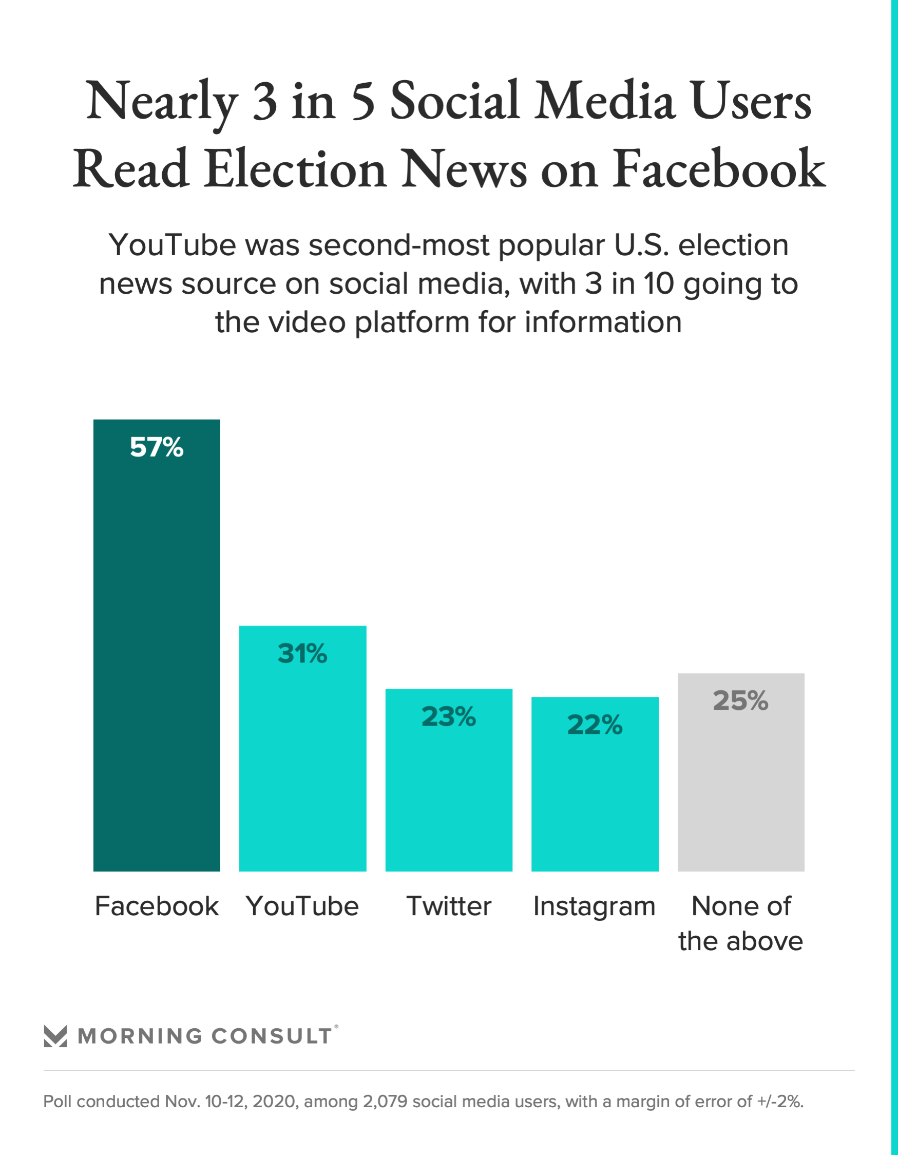 Facebook was the most popular social media site for election news: 57% read news there, followed by 31% who gather information from YouTube.