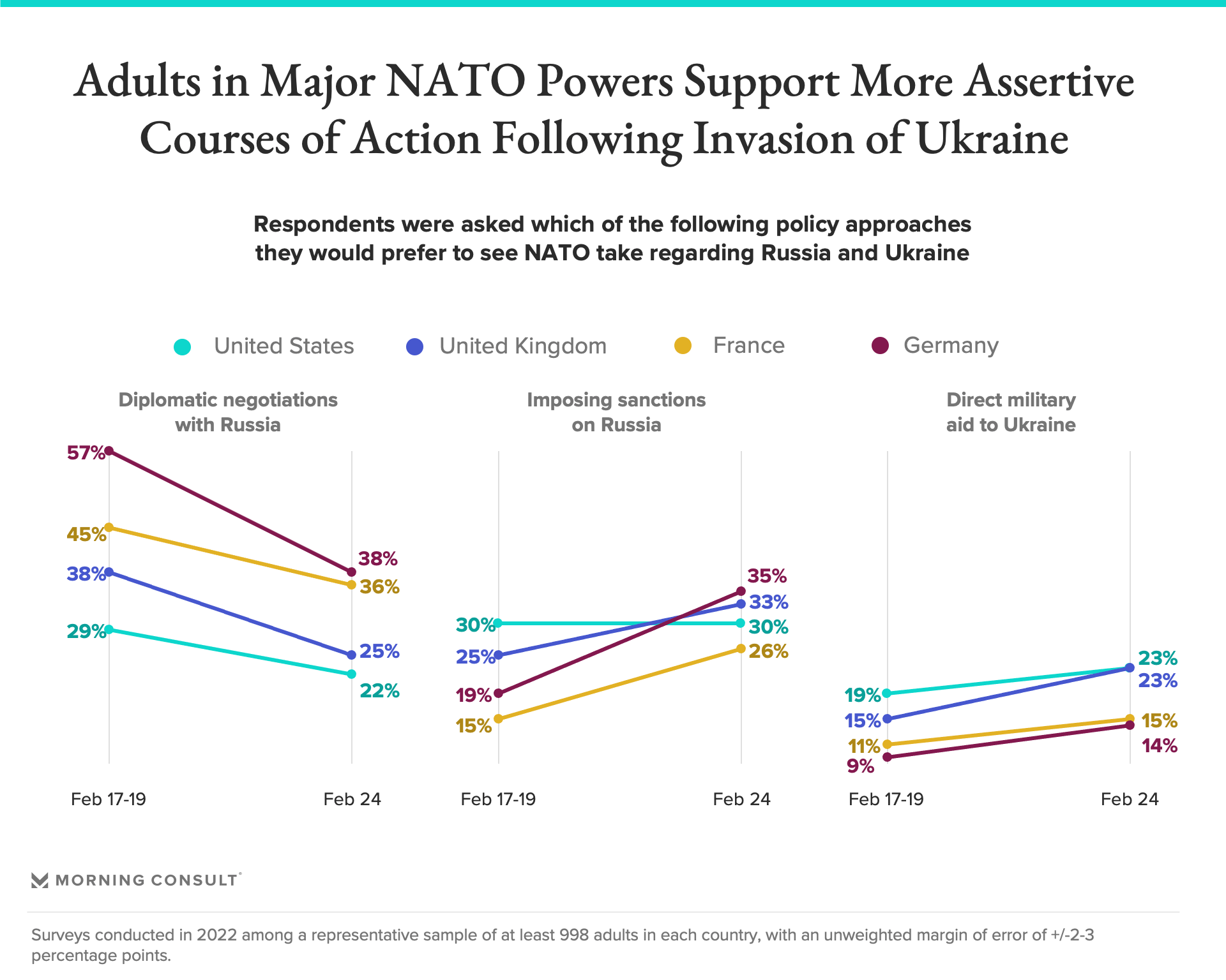 But even though Western populations aren’t falling in line behind their leaders, they have become much more hardened in their views of how NATO should handle Russia’s aggression, with the share of people backing diplomacy over sanctions or direct military aid to Ukraine falling 19 points in Germany, 13 points in the United Kingdom, 9 points in France and 7 points in the United States.