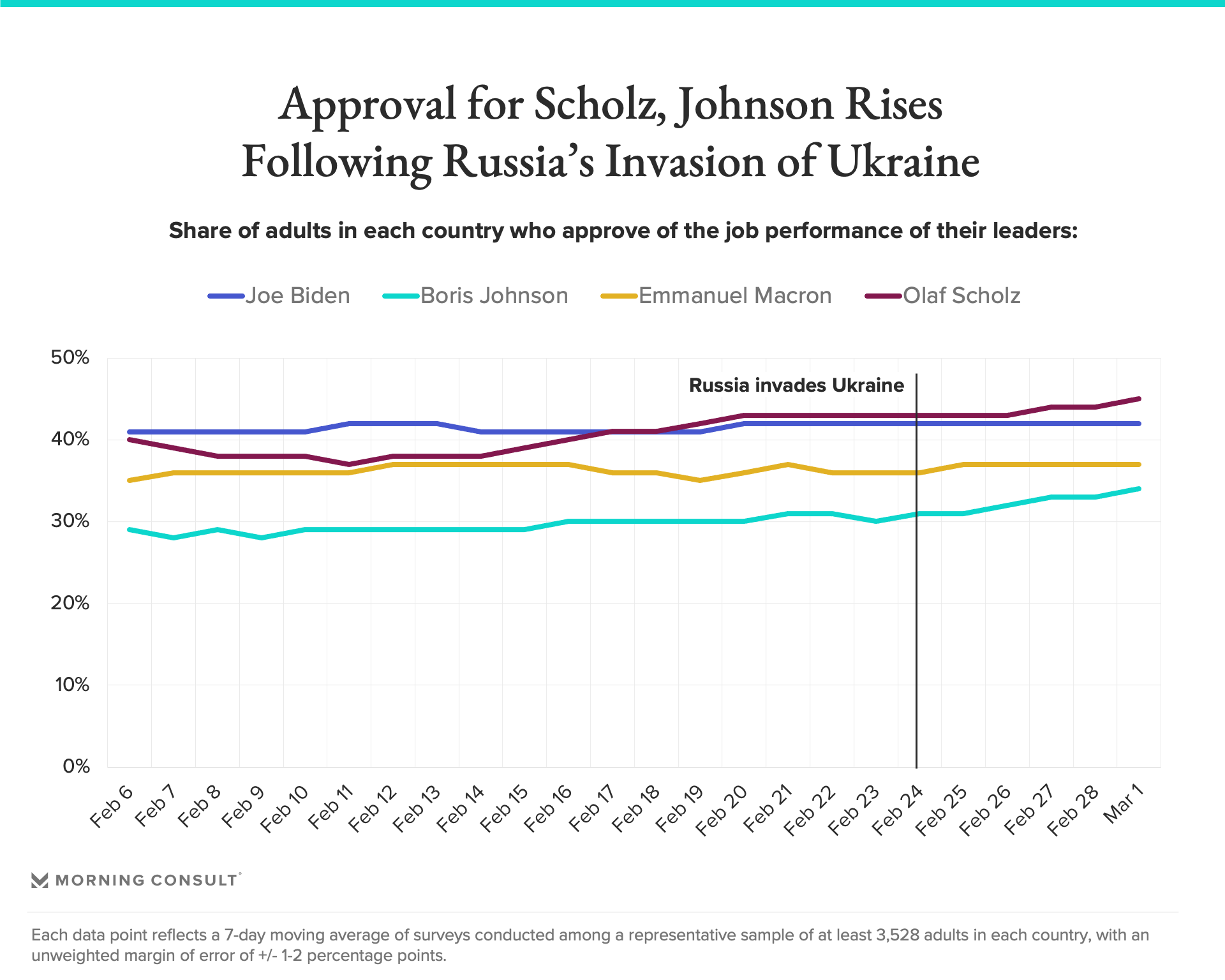 While national leaders on a wartime footing often benefit from a surge of support from a unifying public that faces a common threat, Morning Consult trend data across NATO’s four largest economies shows that only two chief governing executives are seeing upticks in job approval in the wake of Russia’s invasion of Ukraine.