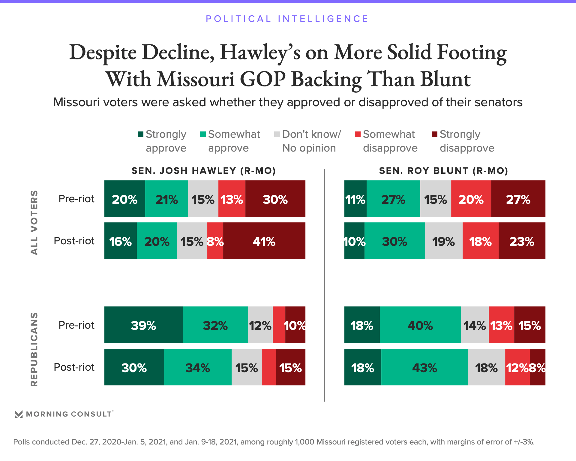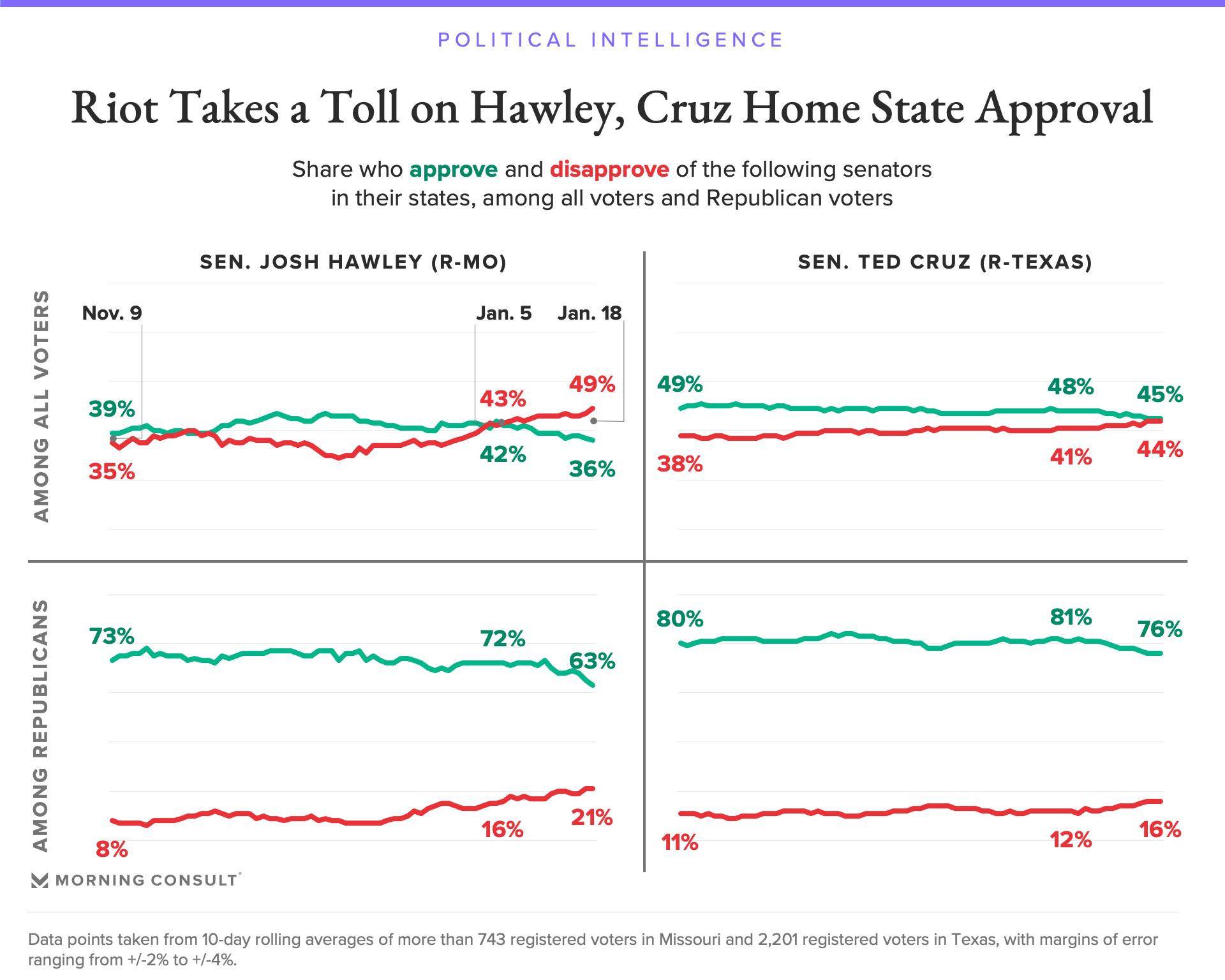 Between Morning Consult Political Intelligence tracking conducted Dec. 27 through Jan. 5, before the Jan. 6 Capitol riot, and then again from Jan. 9-18, Hawley’s approval rating among Missouri Republicans fell 9 percentage points, while Cruz saw a 5-point dip in his job approval among Texas Republicans during the same time. But as some lawmakers call for their ouster from office, the post-riot tracking found both legislators remain on stronger footing with the party’s base than the more senior senators with whom they serve.