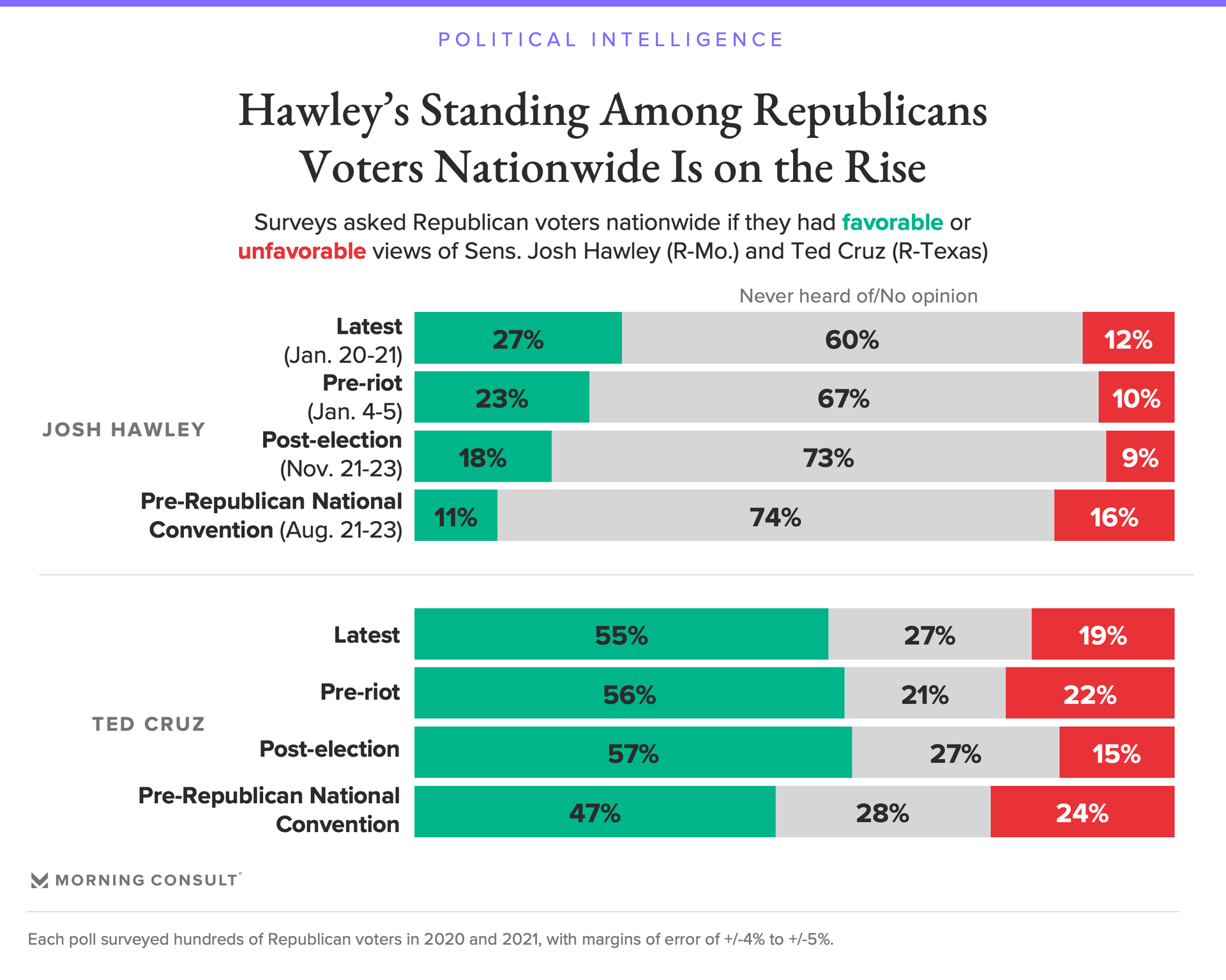 The comparatively fresh-faced Hawley, in particular, has recently managed to raise his profile among Republican voters nationwide: Since August, the share of Republicans who said they’d never heard of Missouri’s junior senator or had no opinion of him fell 14 points, to 60 percent, while the share who hold favorable opinions about him increased 16 points, to 27 percent -- with much of that movement coming in the two months since the November election.