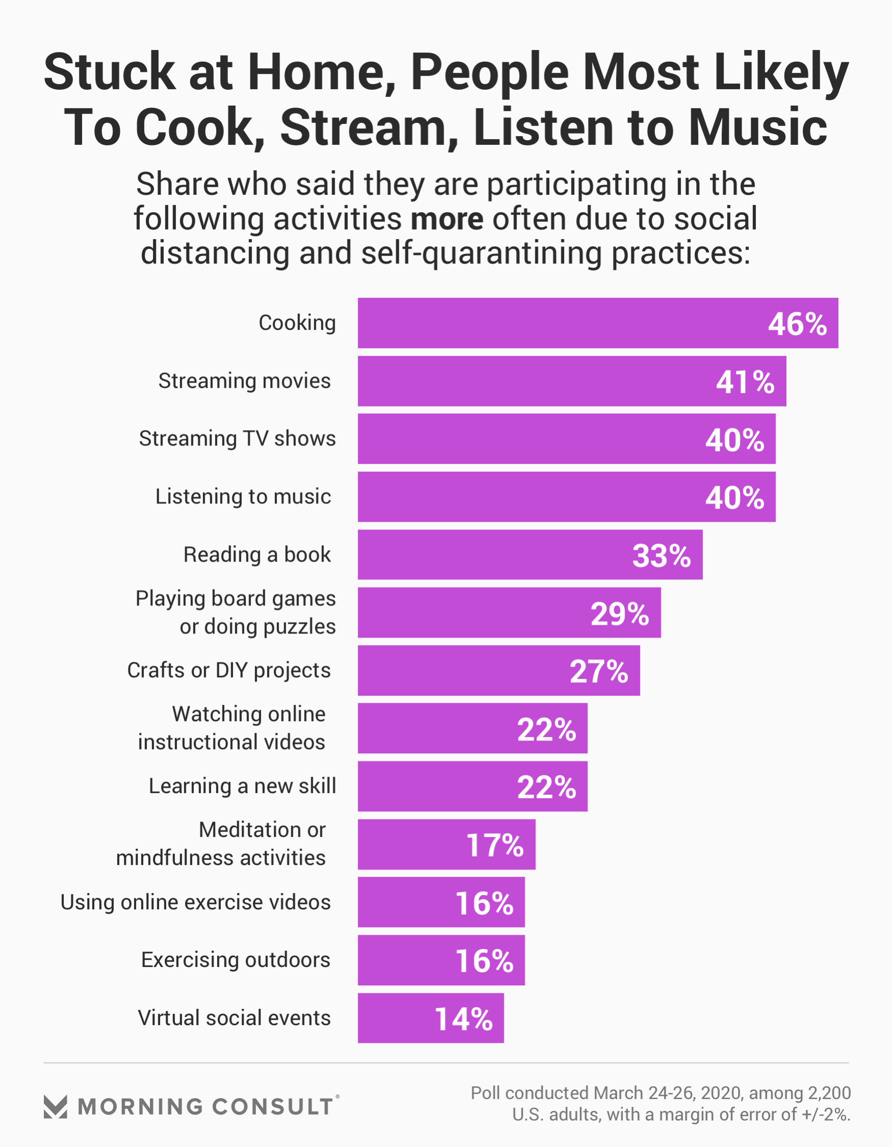 With more than half of the U.S. population being urged to stay at home this week, per CNN, 2 in 5 adults said they were doing more streaming of movies and TV shows, as well as listening to music. Eight percent of adults said they had subscribed to a streaming platform for the first time, while 40 percent said they had already done so before social distancing and self-quarantine measures were in place.