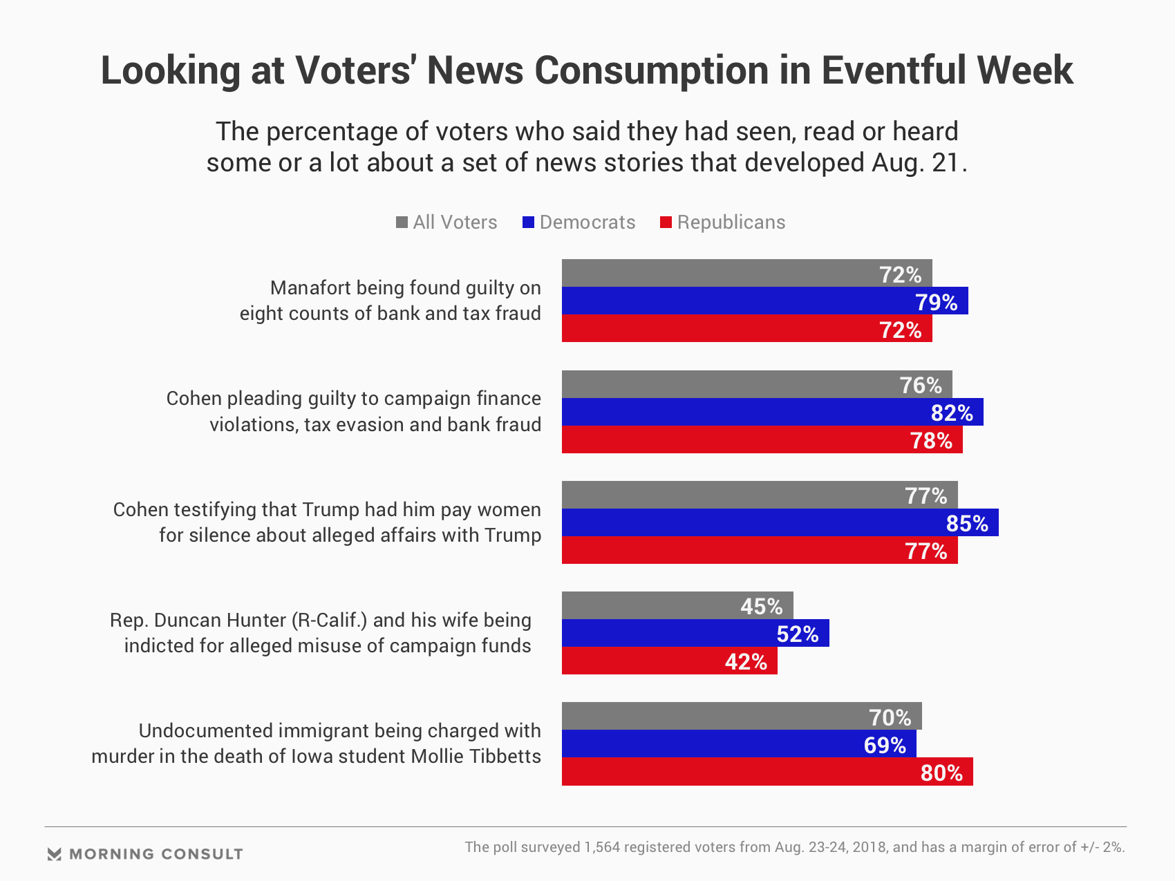 Overall, 72 percent of registered voters heard about the Manafort news, 76 percent heard about Cohen’s guilty plea and 77 percent heard about Cohen’s testimony.