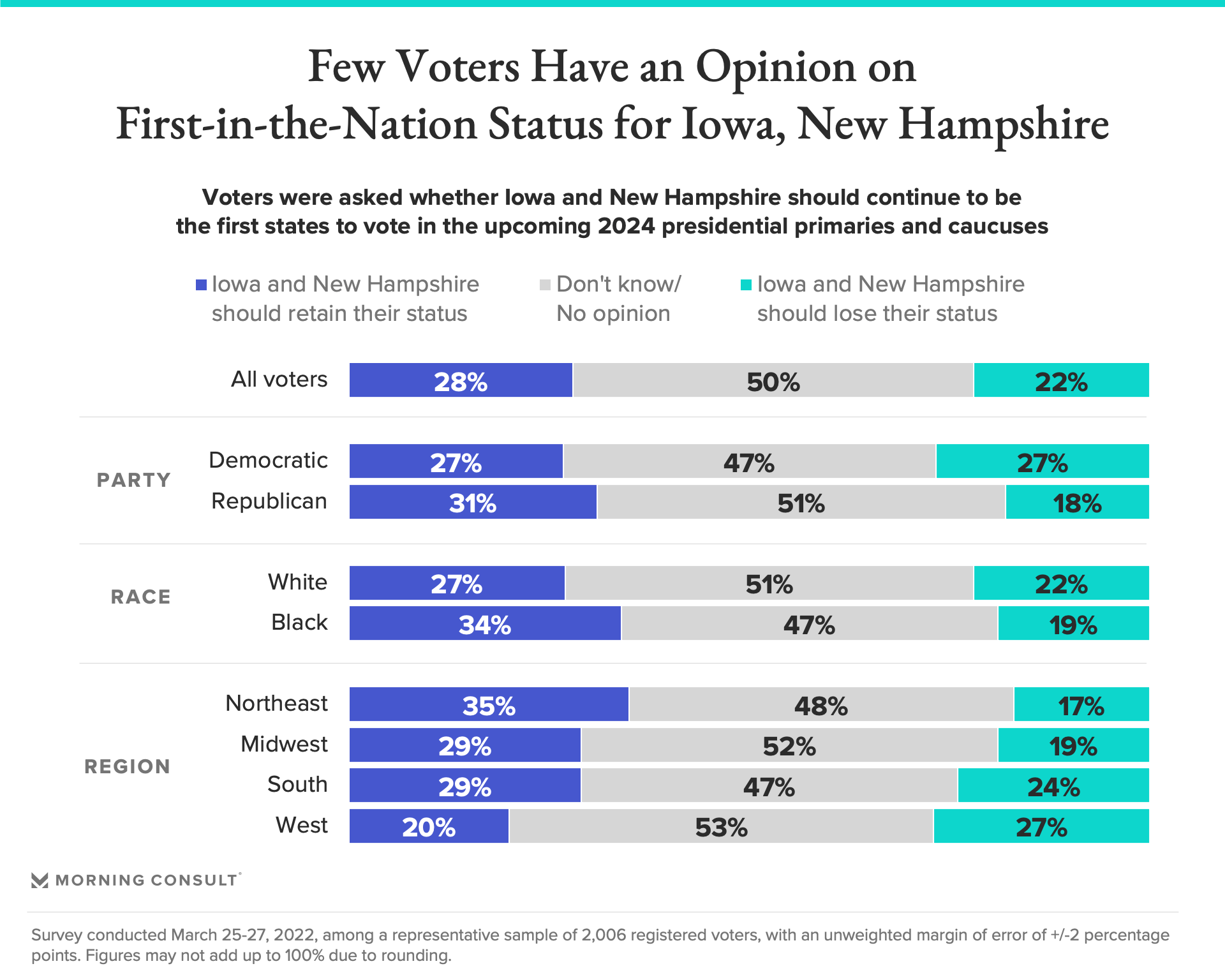 - Republicans are slightly more likely to support sticking with Iowa and New Hampshire, with 31% approving of their position and 18% saying they should lose their status.