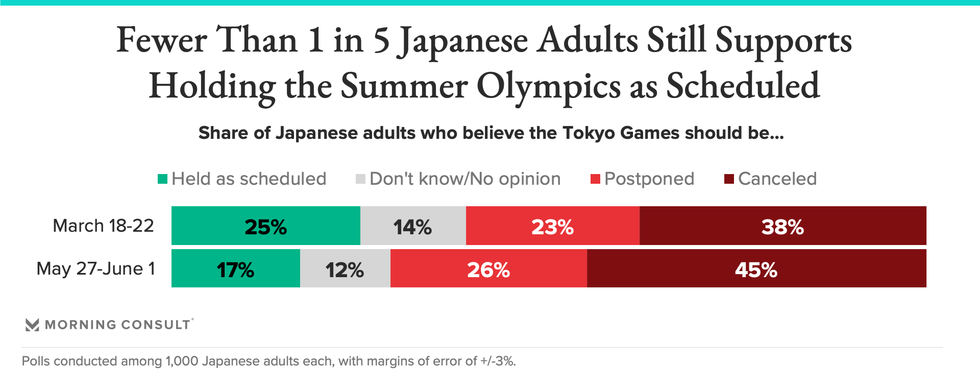In a Morning Consult poll conducted May 27-June 1, just 17 percent of Japanese adults said the Tokyo Games should be held as scheduled, down from 25 percent in a March poll. Meanwhile, 71 percent of respondents favored either postponing the games (26 percent) or canceling them altogether (45 percent), up from 61 percent in March.