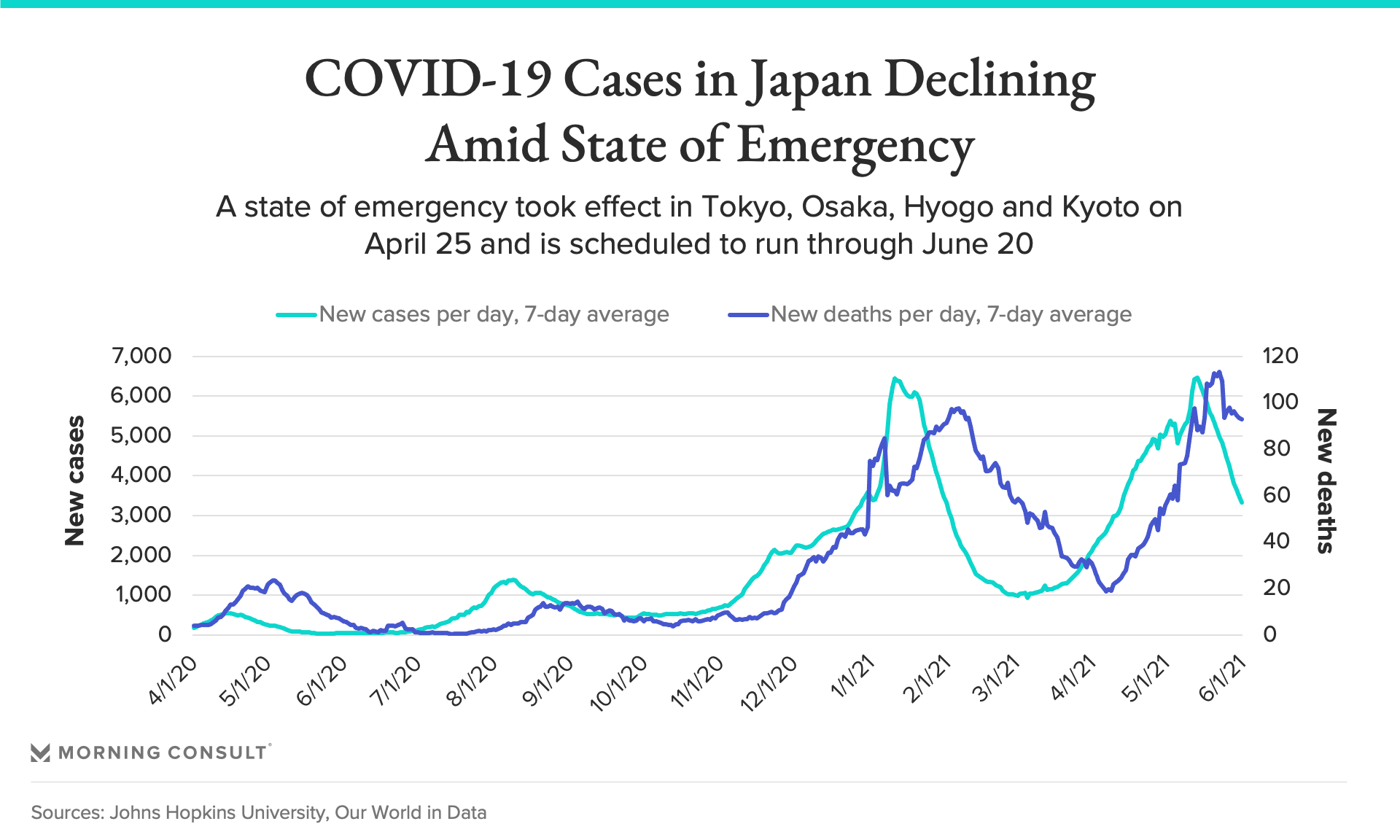 The decline in support for the Tokyo Games, which were first scheduled for July 2020 and postponed in March of last year due to the coronavirus pandemic, over the past several months coincides with worsening coronavirus conditions in Japan. Last week, the state of emergency for Tokyo, Osaka and seven other prefectures, which dates back to April 25, was extended through June 20.