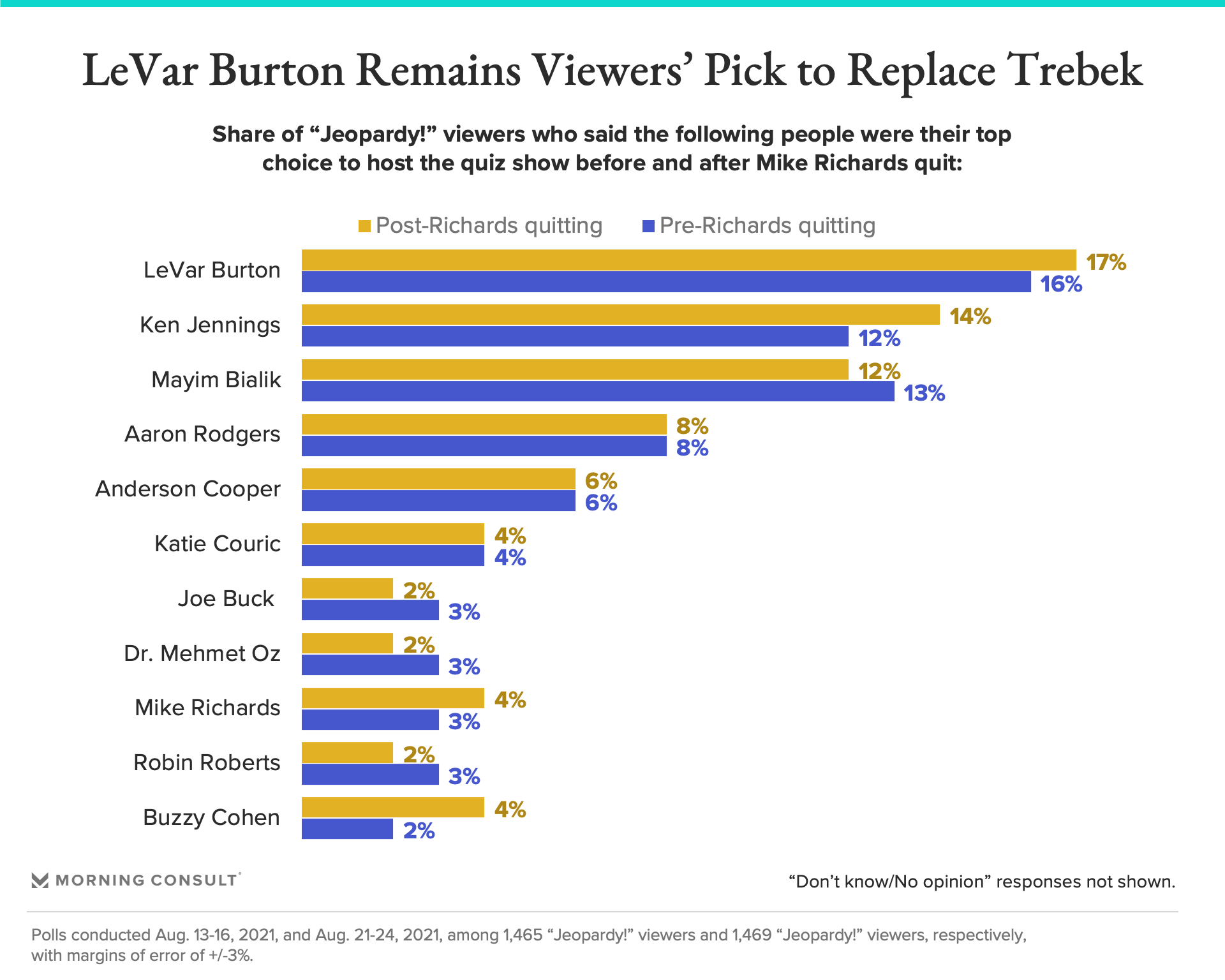 An Aug. 21-24 Morning Consult survey found Burton, a recent “CBS This Morning” guest host and former presenter of “Reading Rainbow,” remained viewers’ top pick to take over as “Jeopardy!” host, with 17 percent of the 1,469 “Jeopardy!” viewers surveyed saying he was their preferred replacement, up slightly from 16 percent in an Aug. 13-16 survey.