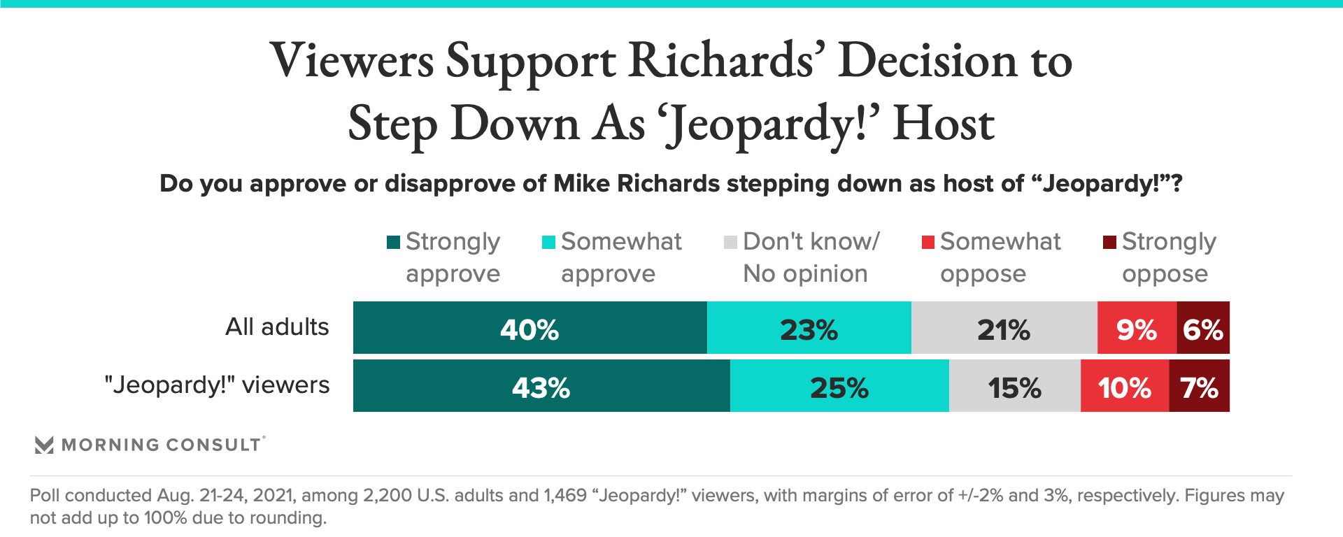 Adults overall (63 percent) and “Jeopardy!” viewers (68 percent) largely supported Richards giving up his role as host. He will remain the program’s executive producer.