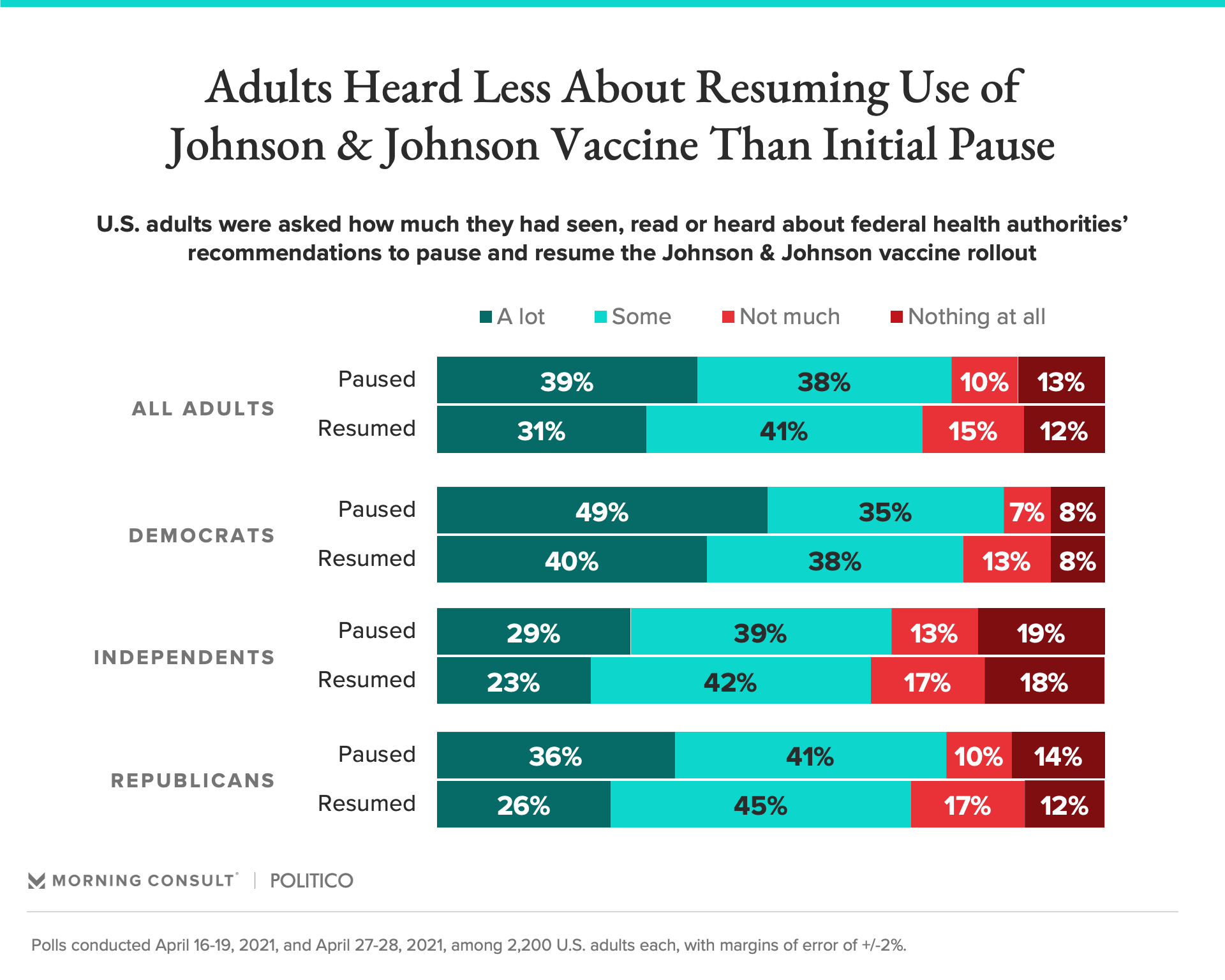 The public’s willingness to get vaccinated didn’t appear dampened by the pause, which lifted April 23 after federal health authorities concluded the benefit of the shots outweighed the risks. But new Morning Consult/Politico polling identified a notable information gap: When the J&J pause was initially announced, 77 percent of U.S. adults said they had seen, read or heard either a lot or some about it. When the vaccine rollout resumed, 72 percent said the same.