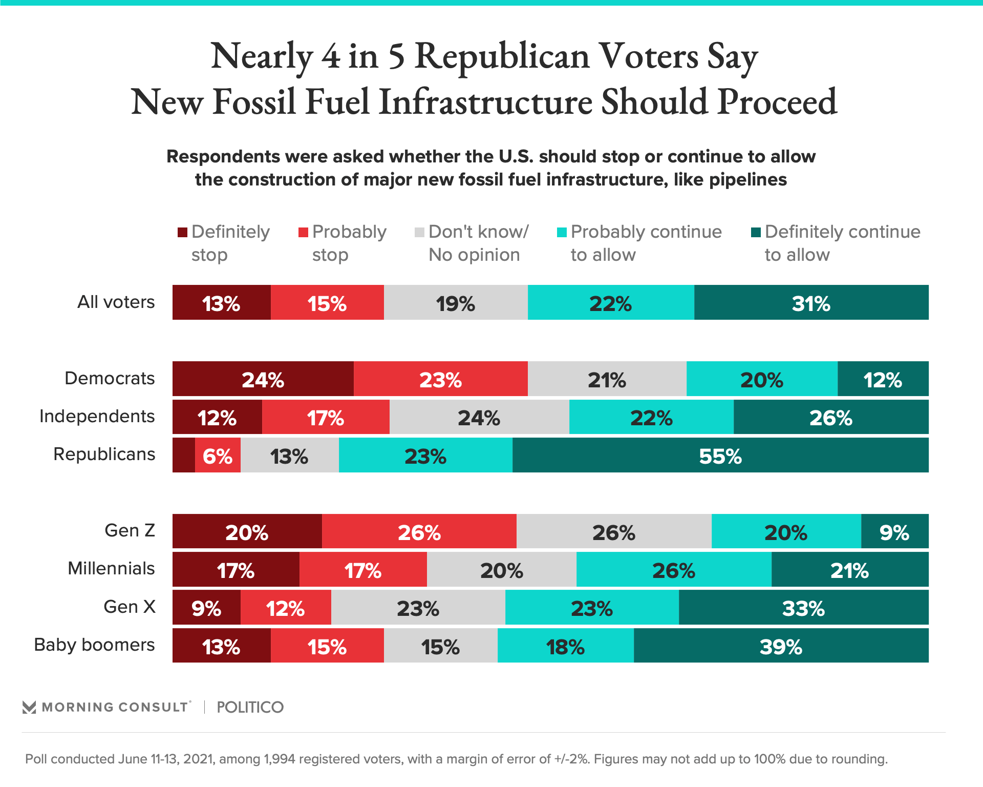 Meanwhile, 53 percent of voters say the United States should continue to allow the construction of major new fossil fuel infrastructure like pipelines (31 percent “definitely” and 22 percent “probably”), while just 28 percent said the country should stop (13 percent “definitely” and 15 percent “probably”).