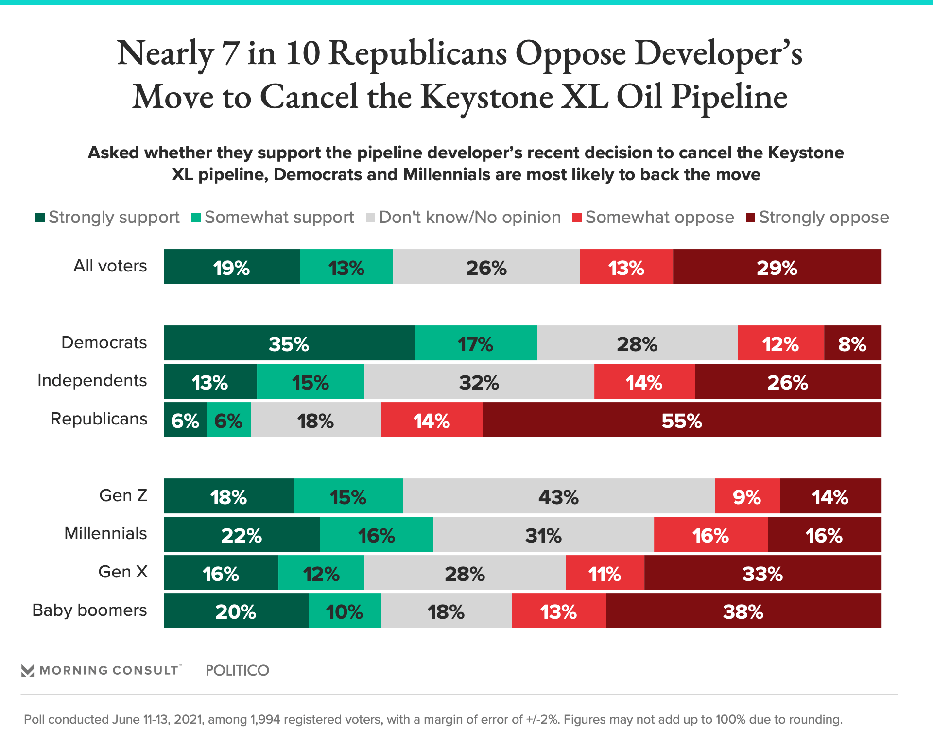 Democrats were most strongly in support of TC Energy’s decision (52 percent) while Republicans opposed it in large numbers (69 percent). Republicans were also most likely to take a stance on the subject, with only 18 percent saying they did not know or had no opinion compared to 26 percent of all voters who said the same.