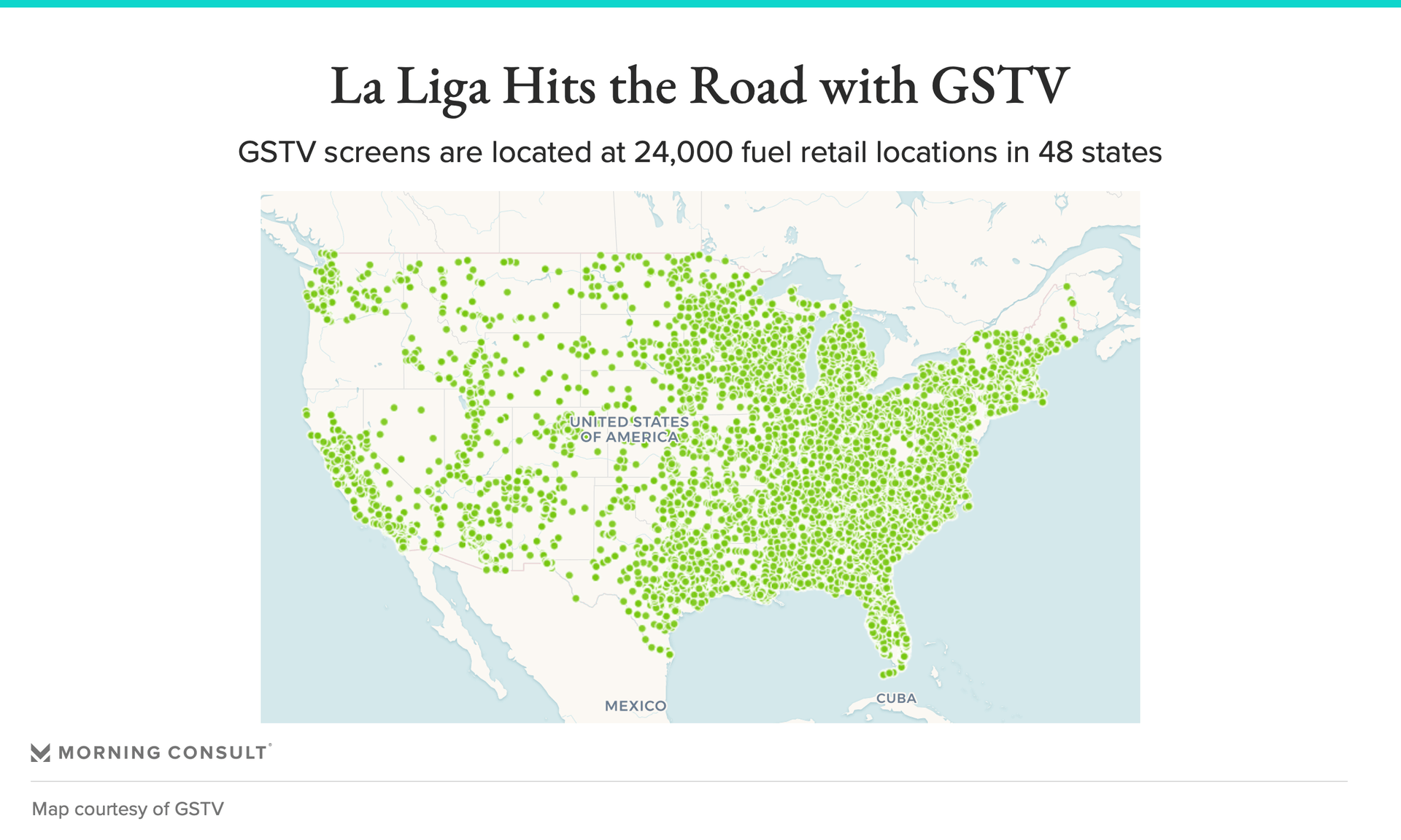 La Liga is the latest sports property to sign on as a content partner for GSTV, a nationwide video network with screens on fuel dispensers at tens of thousands of filling stations across the country that play both video and audio. The company says it reaches 1 in 3 U.S. adults each month when they stop to fuel up their vehicle. Sean McCaffrey, president and chief executive of GSTV, said the average fuel-up takes three to five minutes, meaning drivers who fill up regularly are exposed to GSTV for 15 to 20 minutes a month.