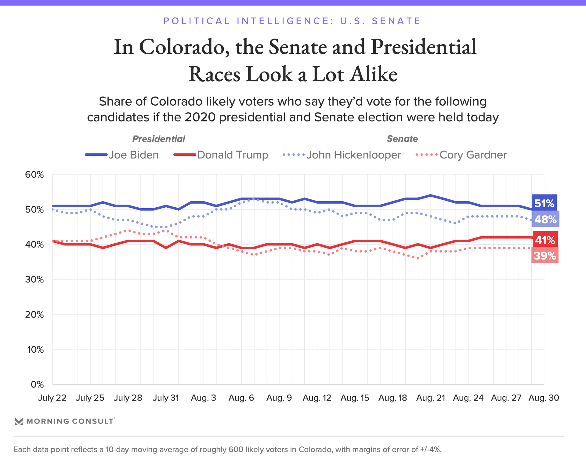 Overall, the polling of 638 likely voters found Gardner trailing Hickenlooper in the Centennial State by 9 points, 39 percent to 48 percent, which tracks with his average deficit over the past month and mirrors the top-of-the-ticket contest between President Donald Trump and Democratic presidential nominee Joe Biden.