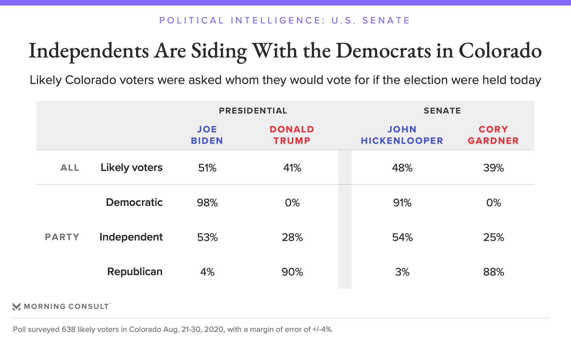 August data compiled by Colorado’s secretary of state shows roughly 42 percent of the state’s electorate does not identify with either of the two major political parties. Morning Consult’s daily tracking among likely voters from Aug. 21-30 shows Hickenlooper leading Gardner by 29 percentage points, 54 percent to 25 percent, among independents -- roughly in line with his average standing with the sizable group since the tracking began more than two months ago.