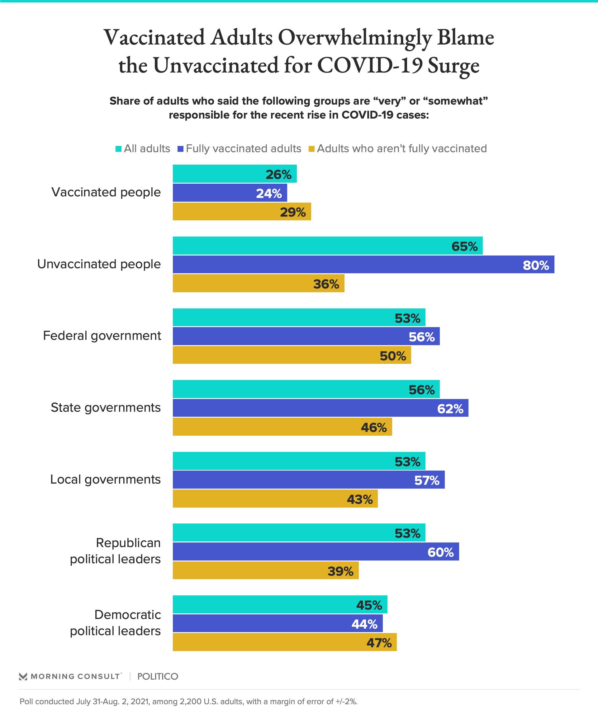 The findings also reflect divisions in the public’s perception of who is to blame for the recent uptick in infections, with 4 in 5 vaccinated adults saying their unvaccinated counterparts are causing the increase. Those who aren’t fully vaccinated were more likely to blame the federal government than any other group, at 50 percent.