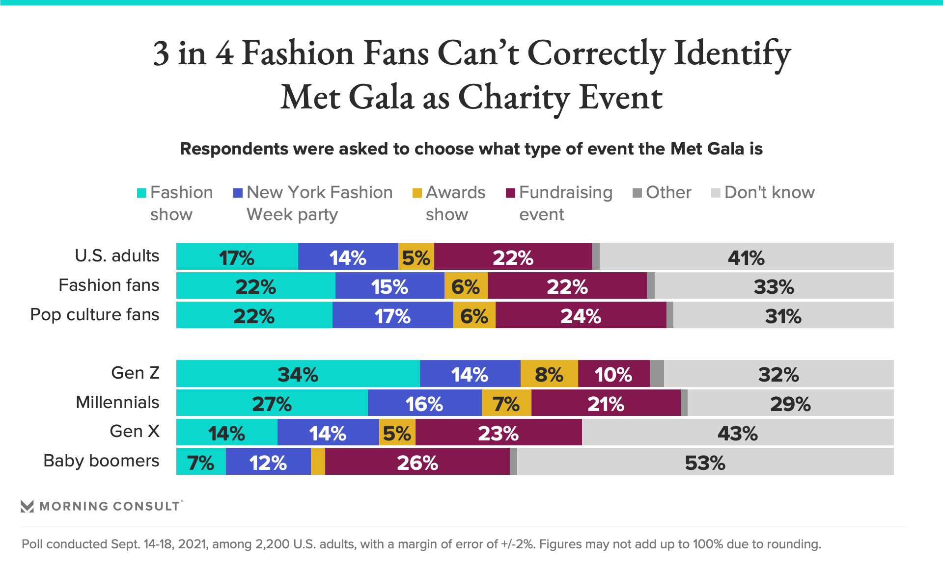 Given a choice of options, 77 percent of self-identified U.S. fashion fans did not correctly identify the Met Gala as a fundraising event, according to a Morning Consult survey of 2,200 U.S. adults conducted Sept. 14-18. The poll carries a margin of error of 2 percentage points.