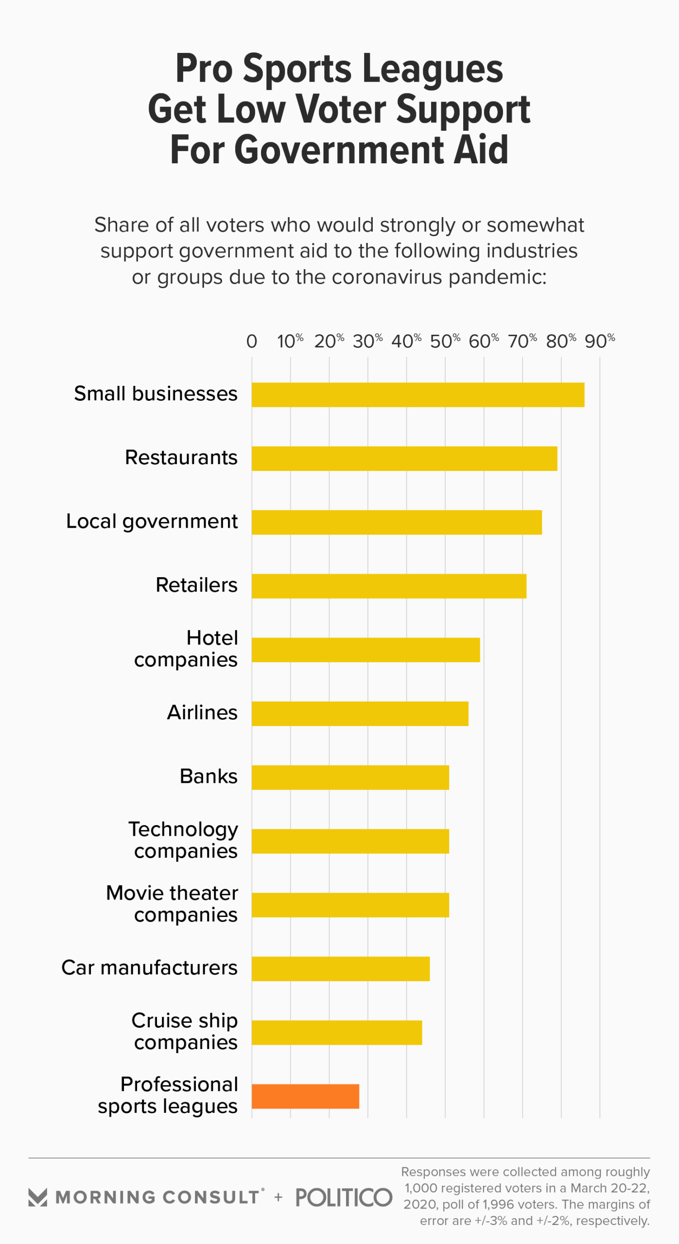 In a Morning Consult/Politico poll from March 20-22, 28 percent of voters said they support financial assistance for professional sports leagues, a smaller share than any of the other industries included in the survey. By comparison, 79 percent of voters support assistance for restaurants, 56 percent support assistance for airlines and 44 percent support assistance for cruise ship companies.