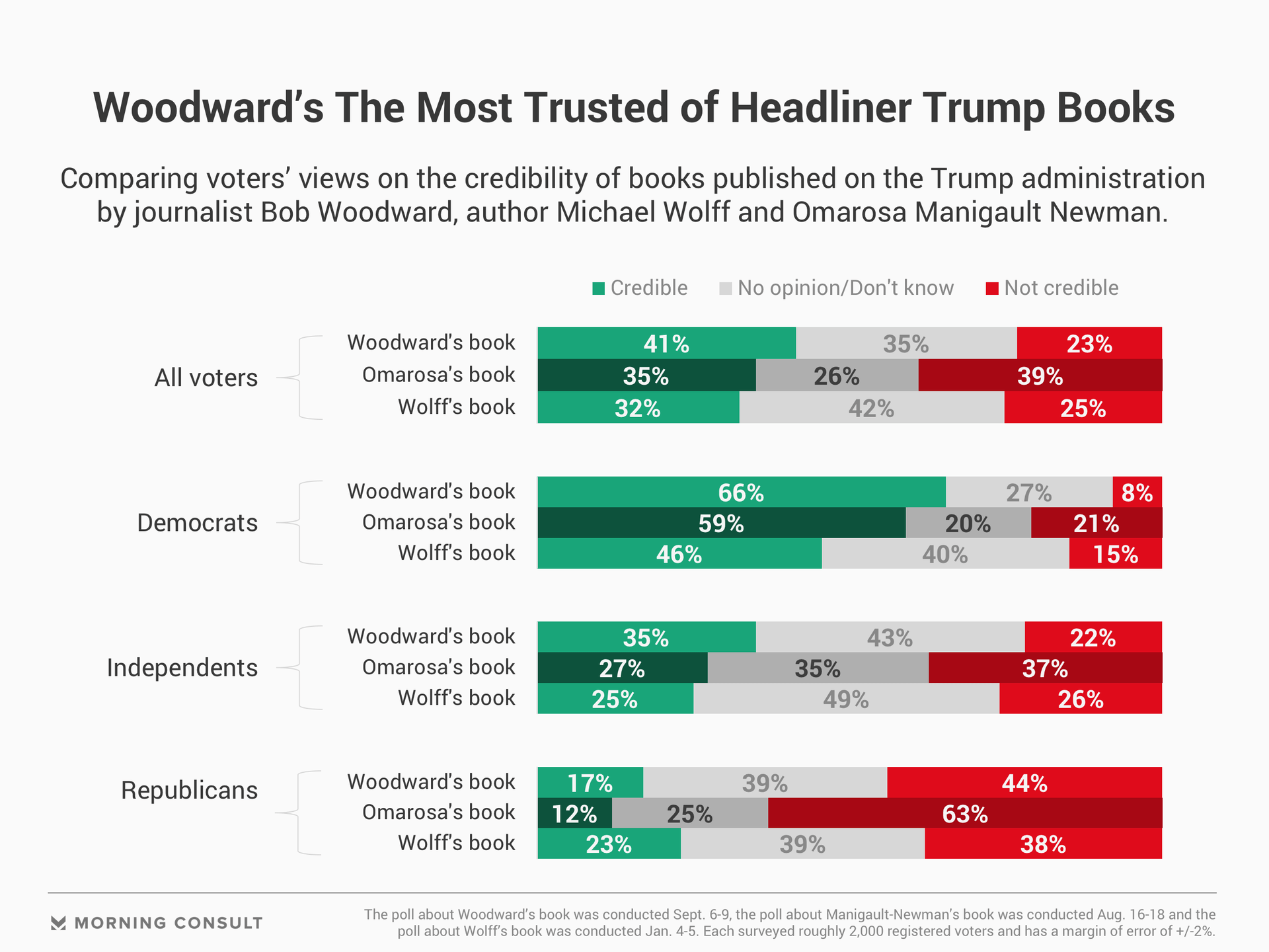 Longtime Washington Post journalist Bob Woodward’s new book, “Fear: Trump in the White House,” is trusted by more voters than two previous headline-grabbing accounts of Donald Trump’s presidency: Michael Wolff’s “Fire and Fury: Inside the Trump White House” and Omarosa Manigault Newman’s “Unhinged: An Insider’s Account of the Trump White House.”