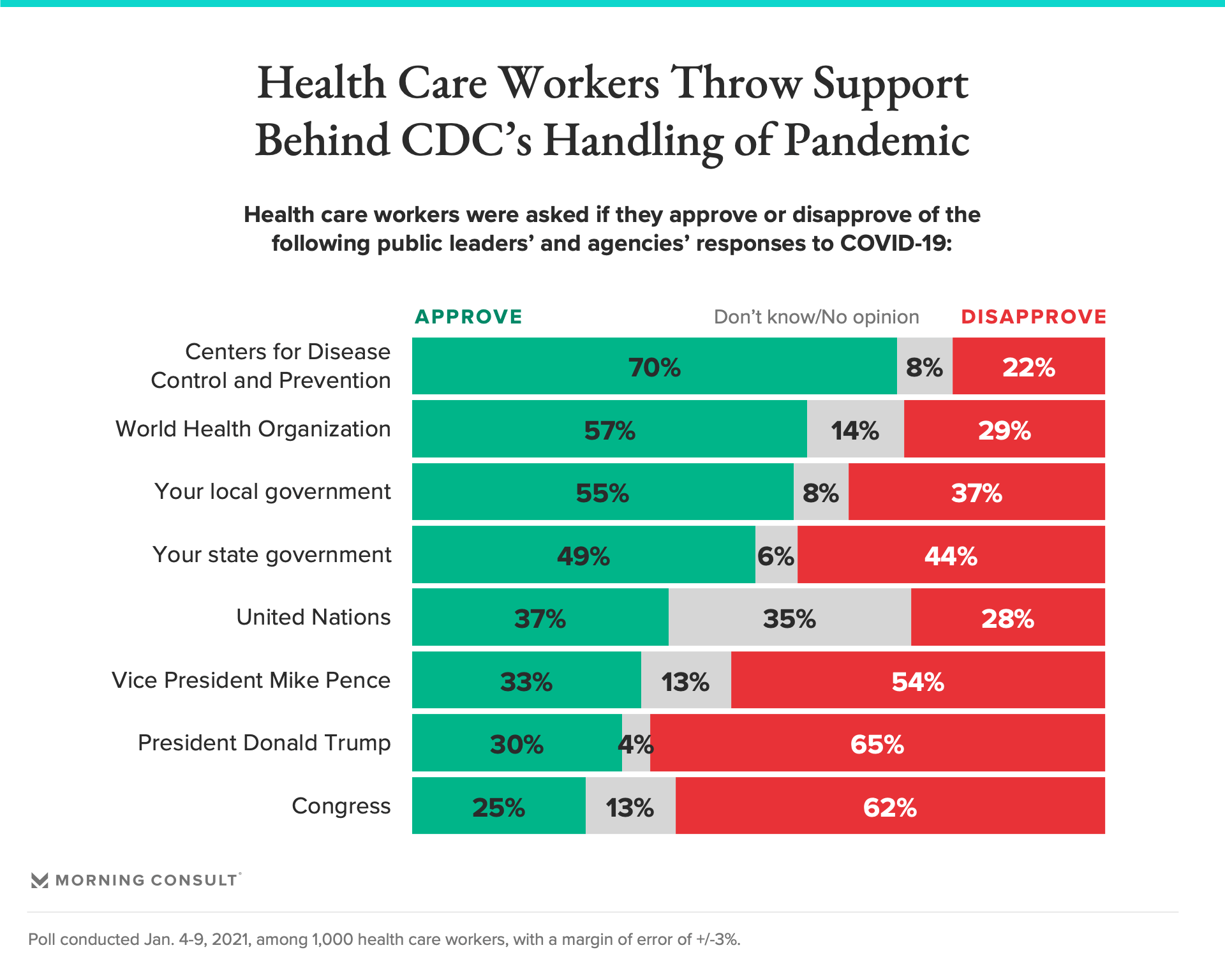 In all, 65 percent of health care workers disapproved of how Trump handled the pandemic and an equal share said his administration was not doing enough to respond to COVID-19, while 62 percent looked poorly on Congress’ efforts, according to a new Morning Consult survey of 1,000 health care professionals conducted Jan. 4-9. Another 30 percent approved of Trump’s handling of the pandemic, while 25 percent approved of Congress’ approach.
