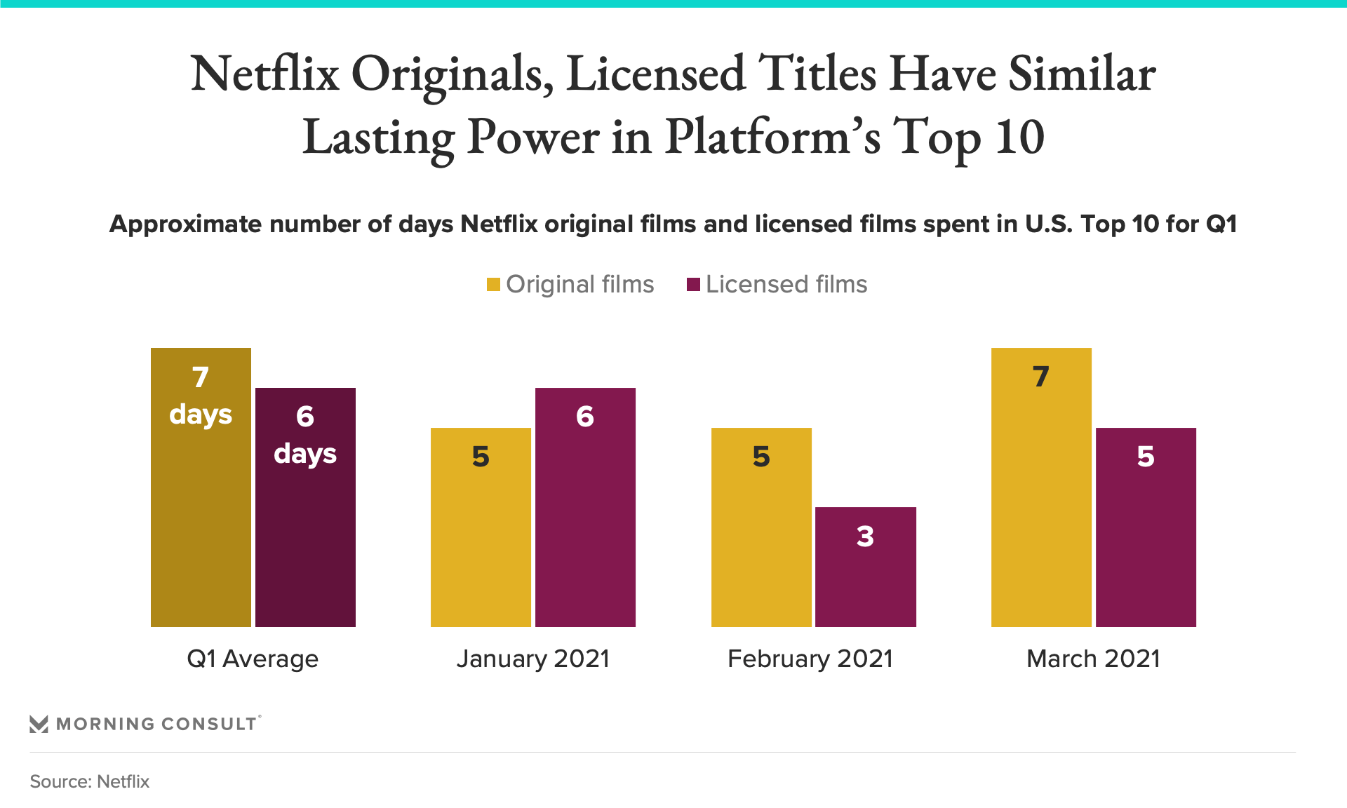 On average, Netflix original films were in the service’s U.S. Top 10 for roughly seven days in the first quarter of 2021, while licensed titles were in the rankings for approximately six days.