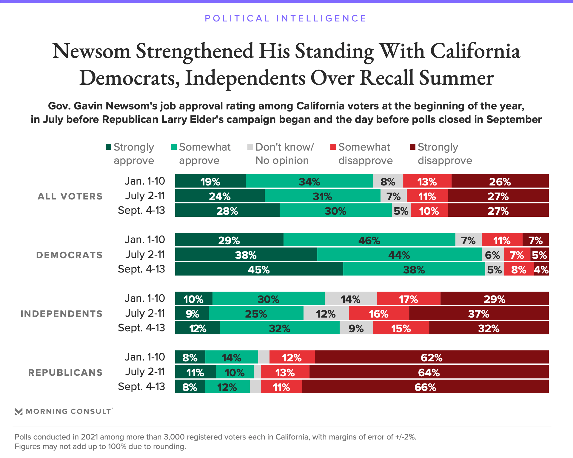 The latest surveys, conducted Sept. 4-13 as voting in the recall entered its final days, found that 57 percent of California voters approved of Newsom and 37 percent disapproved. That marks an improvement from where he began the year, when 53 percent approved and 40 percent disapproved. What’s more, Morning Consult’s polling shows Newsom’s approval rating among all Golden State voters never dipped below 52 percent, 2 percentage points higher than the 50 percent in support he needed to avoid a recall.